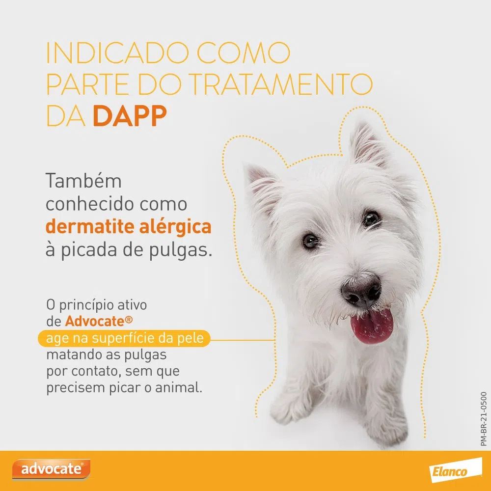 Logo no primeiro dia de tratamento o Combo Antiparasitário Advocate para Cães 10 a 25kg já elimina as pulgas adultas presentes nos cães, continua eliminando novas pulgas reinfestantes por no mínimo 4 semanas. As novas pulgas, vindas do ambiente ou passeios, morrem após um curto período de contato com a pele do cão já tratado. O tratamento mensal é recomendado para obter-se um controle antipulgas e prevenção ideal. O Combo Antiparasitário Advocate para Cães 10 a 25kg pode ser usado como parte do tratamento estratégico da dermatite alérgica a picada de pulga.