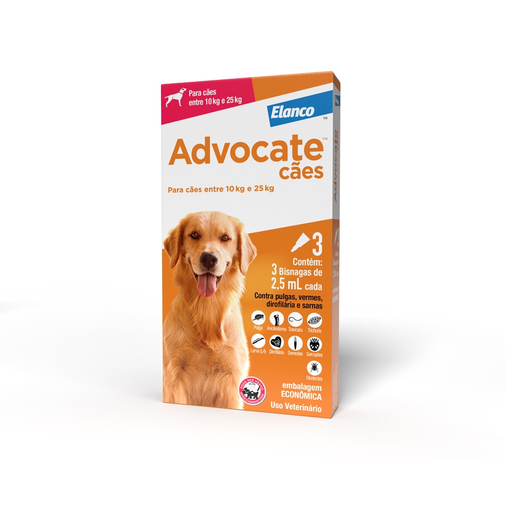 O Combo Antiparasitário Advocate para Cães 10 a 25kg oferece prevenção e tratamento das infestações por pulgas (Ctenocephalides spp.), piolhos (Linognathus setosus e Trichodectes canis), ácaros das sarnas otodécica, sarcóptica e demodécica (Otodectes cynotis, Sarcoptes scabiei e Demodex canis) e os vermes intestinais Ancylostoma caninum, Toxocara canise Uncinaria stenocephala, incluindo suas larvas de quarto estágio (L4) e adultos imaturos; bem como Toxascaris leonina e Trichuris vulpis em cães. Previne também a infestação causada pelo verme cardíaco Dirofilaria immitis quando administrado uma vez por mês.