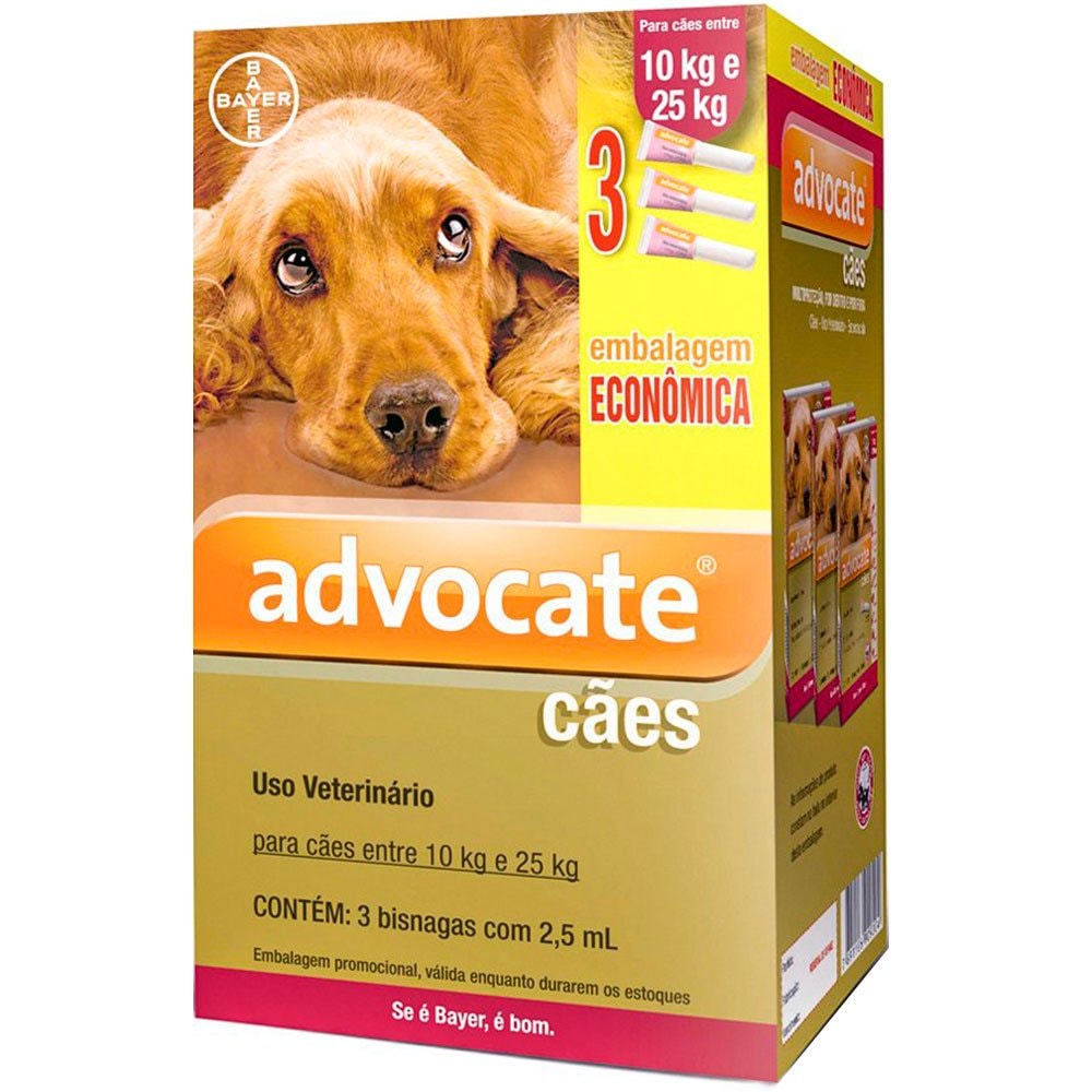 Para cães acima de 25 kg, aplicar o conteúdo de uma única bisnaga de 4,0 mL em 4 pontos ao longo da linha do dorso do animal. Para cães acima de 40 kg, usar uma combinação adequada de bisnagas, complementando o tratamento obedecendo à proporção de 1 mL de Advocate para cada 10 kg de peso corporal.
