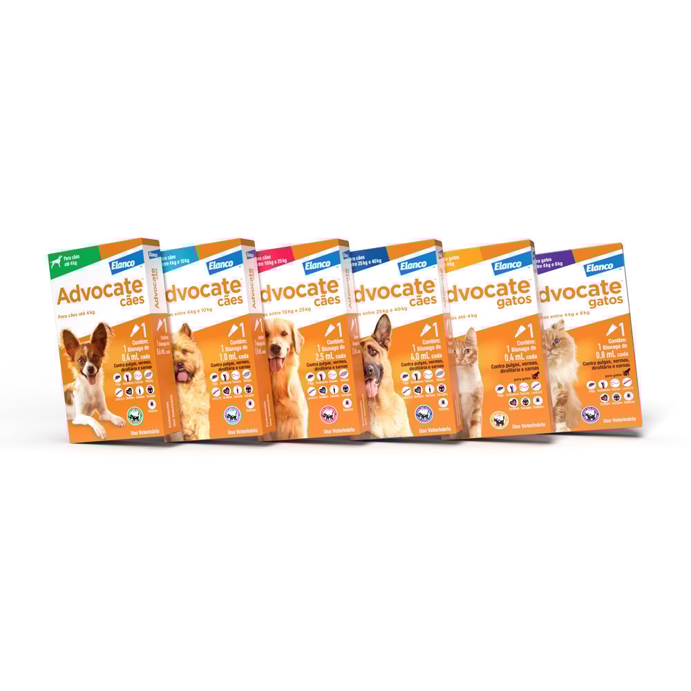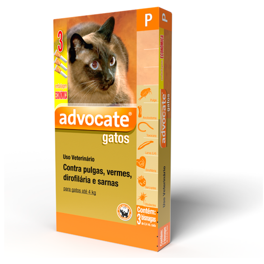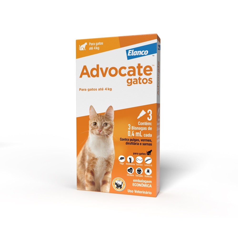 O Combo Antiparasitário Advocate para Gatos 0 a 4kg oferece prevenção e tratamento das infestações por pulgas (Ctenocephalides spp.), ácaros das sarnas otodécica e sarcóptica (Otodectes cynotis e Sarcoptes scabiei) e os vermes intestinais Ancylostoma tubaeforme, Ancylostoma braziliense e Toxocara cati, incluindo suas larvas de quarto estágio (L4) e adultos imaturos em gatos. Advocate previne a infestação causada pelo verme cardíaco Dirofilaria immitis quando administrado uma vez por mês.