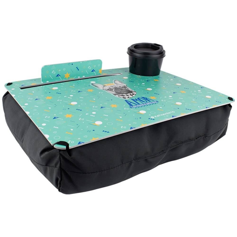 Almofada com bandeja para os verdadeiros Petlovers! Para usar o tablet, computador ou celular no colo e tem um espaço para colocar o copo.