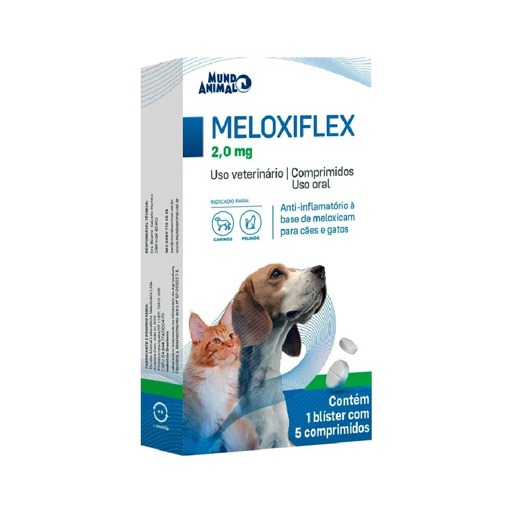 Detalhes do Produto Meloxiflex é o novo anti-inflamatório não esteroide à base de meloxicam do Mundo Animal. É indicado em tratamentos pós operatórios, lesões traumáticas e quadros de inflamação aguda em cães e gatos. Possui ação analgésica e antipirética. Eficiente em patologias osteomusculares. Possui comprimidos palatavéis, com tamanho pequeno e sulcados, facilitando a ingestão pelo animal.