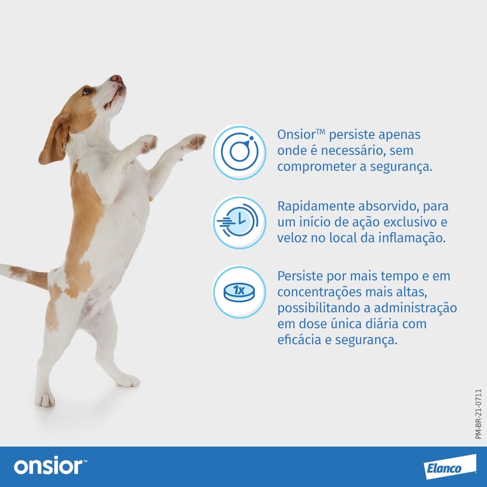 Onsior™ é indicado para o tratamento e alívio da dor e inflamação associadas à osteoartrite e associadas às cirurgias de tecidos moles em cães.
