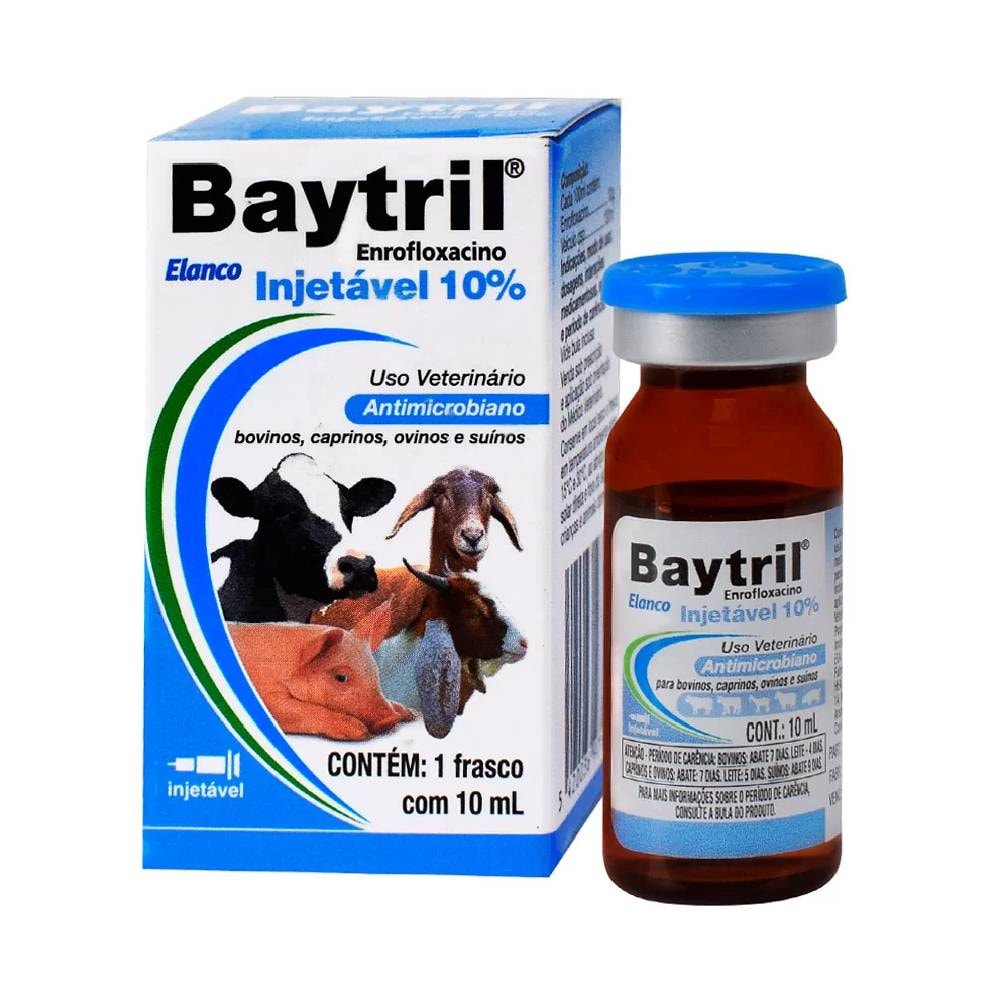 Detalhes do Produto Baytril Injetável 10% atua contra infecções dos bovinos, suínos, ovinos e caprinos causadas por bactérias gram-negativas e gram-positivas, e microplasmas sensíveis ao enrofloxacino.