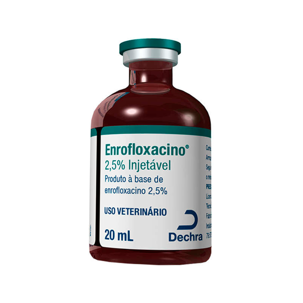 O Enrofloxacino 2,5% Injetável 20 ml é um antibiótico para cães e gatos, da classe das fluoroquinolonas que possuem um largo espectro de ação, sendo o enrofloxacino indicado para o tratamento de um grande número de doenças infecciosas causadas por bactérias gram-positivas, gram-negativas, micoplasmas e espiroquetas sensíveis ao enrofloxacino.