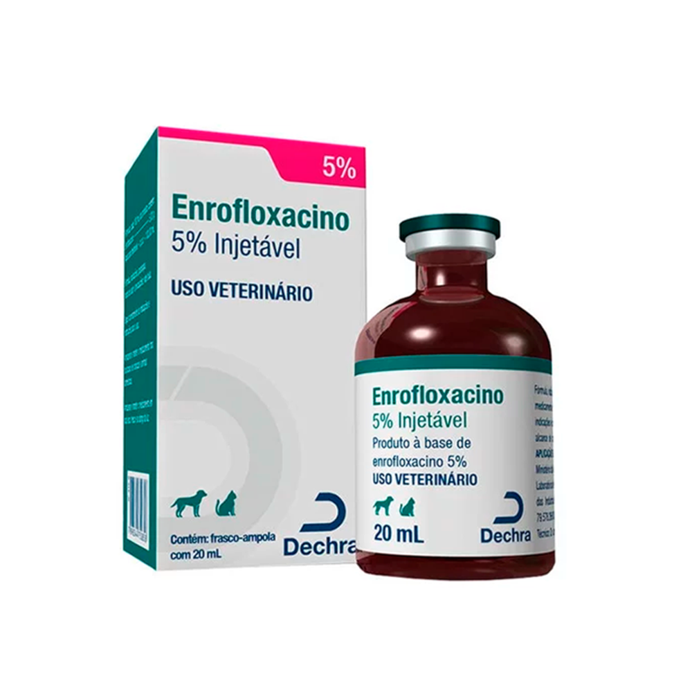 O Enrofloxacino 5% Injetável 20ml da Dechra é um antibiótico da classe das fluoroquinolonas que possuem um largo espectro de ação, sendo o enrofloxacino indicado para o tratamento de um grande número de doenças infecciosas causadas por bactérias gram-positivas, gram-negativas, micoplasmas e espiroquetas sensíveis ao enrofloxacino.