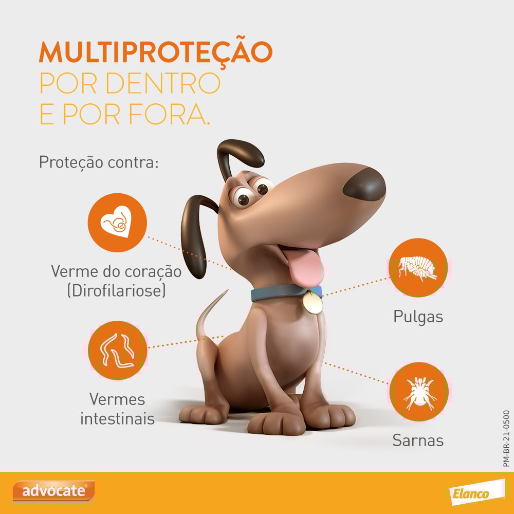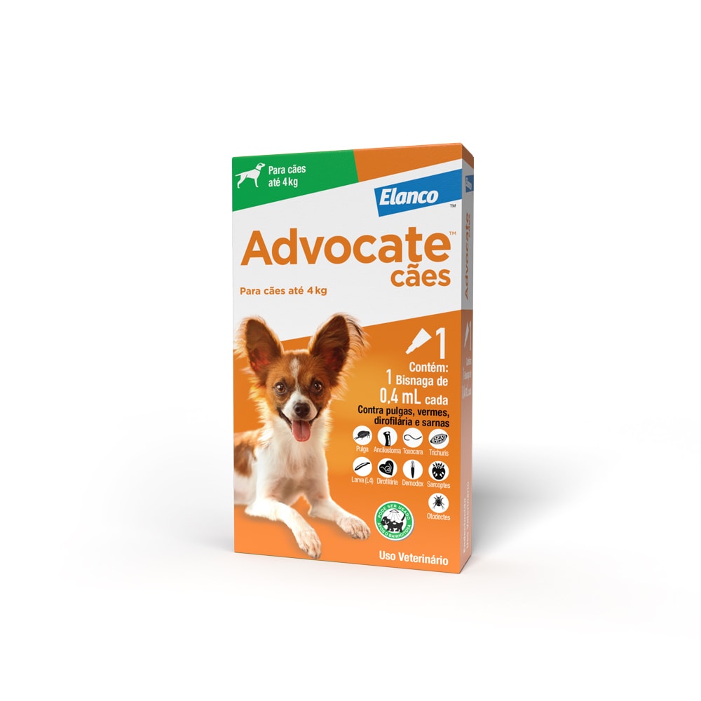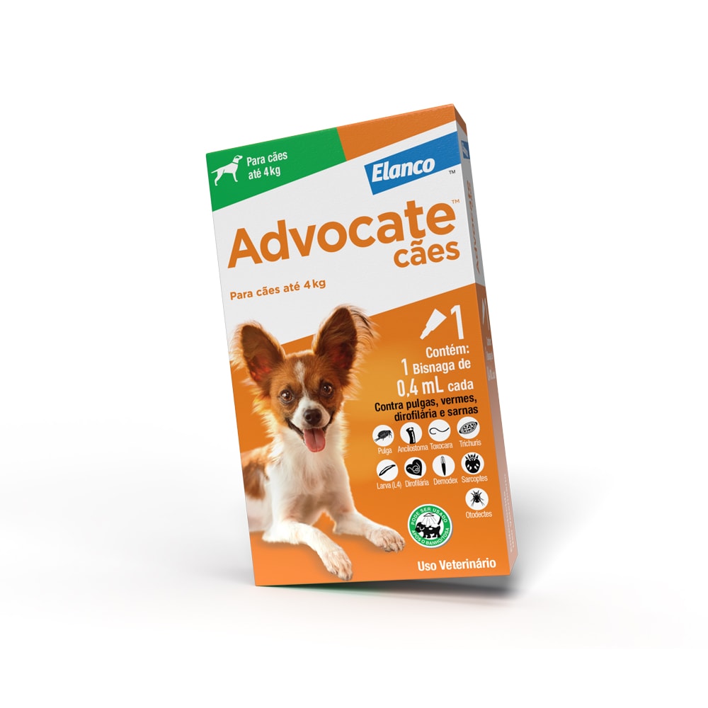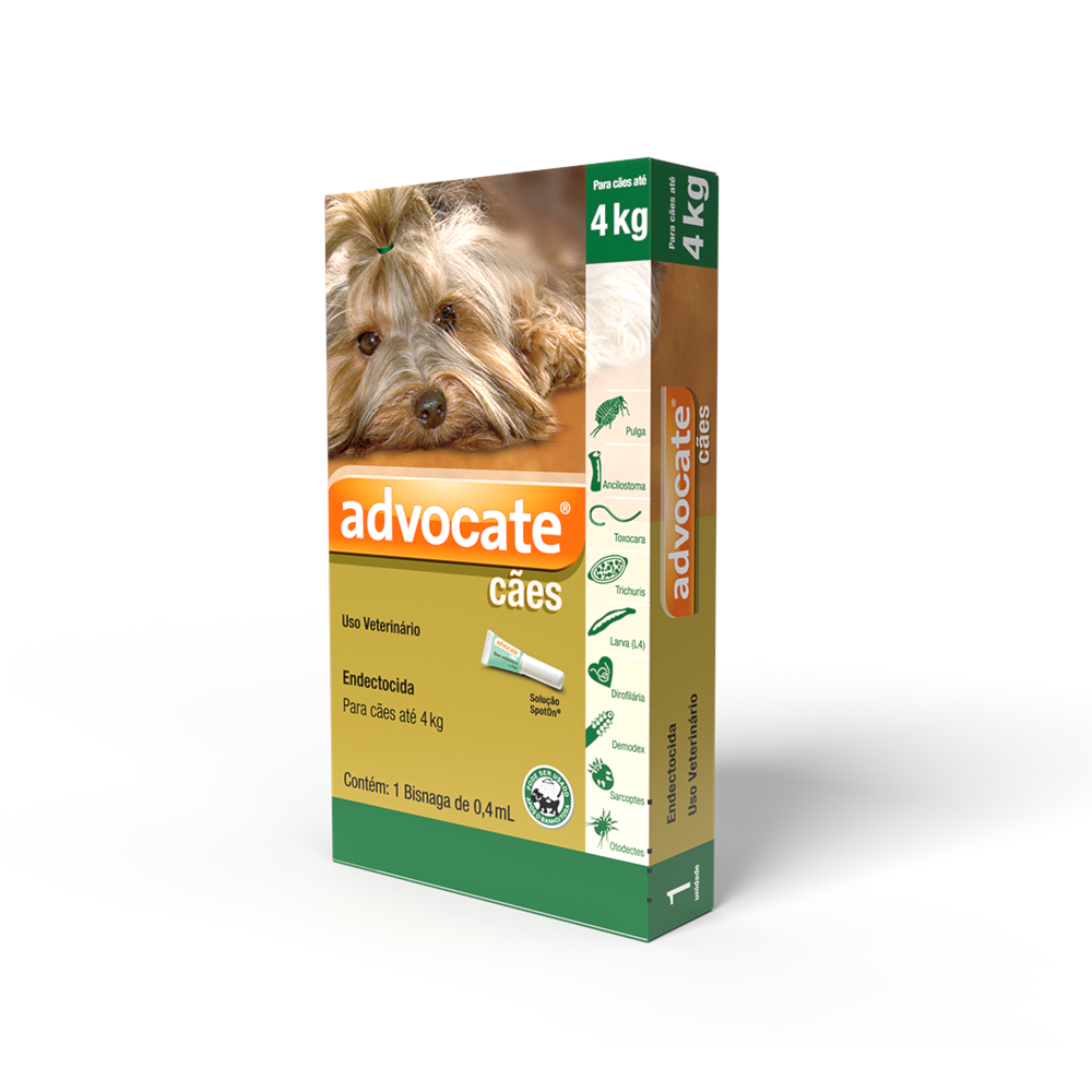 O Antiparasitário Advocate para Cães de 0 a 4 kg oferece prevenção e tratamento das infestações por pulgas (Ctenocephalides spp.), piolhos (Linognathus setosus e Trichodectes canis), ácaros das sarnas otodécica, sarcóptica e demodécica (Otodectes cynotis, Sarcoptes scabiei e Demodex canis) e os vermes intestinais Ancylostoma caninum, Toxocara canise Uncinaria stenocephala, incluindo suas larvas de quarto estágio (L4) e adultos imaturos; bem como Toxascaris leonina e Trichuris vulpis em cães. Previne também a infestação causada pelo verme cardíaco Dirofilaria immitis quando administrado uma vez por mês.