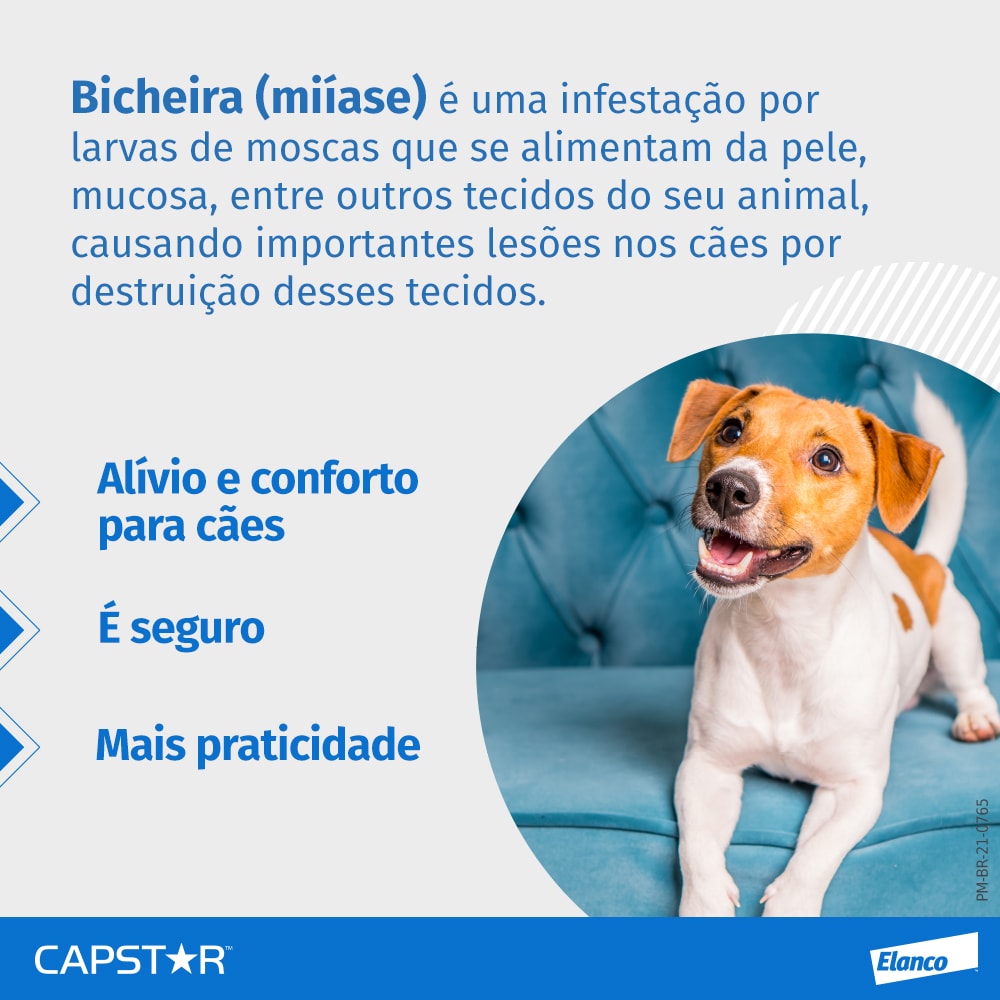 Capstar™ elimina as pulgas adultas e expulsa as larvas da ferida antes de morrerem, diminuindo a manipulação para removê-las com menos dor. Para ambientes já infestados, deve ser realizado o controle integrado para tratamento do ambiente, evitando reinfestações.