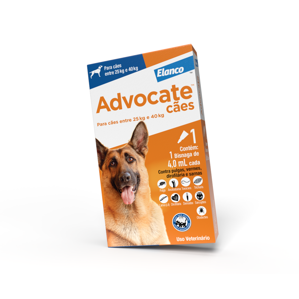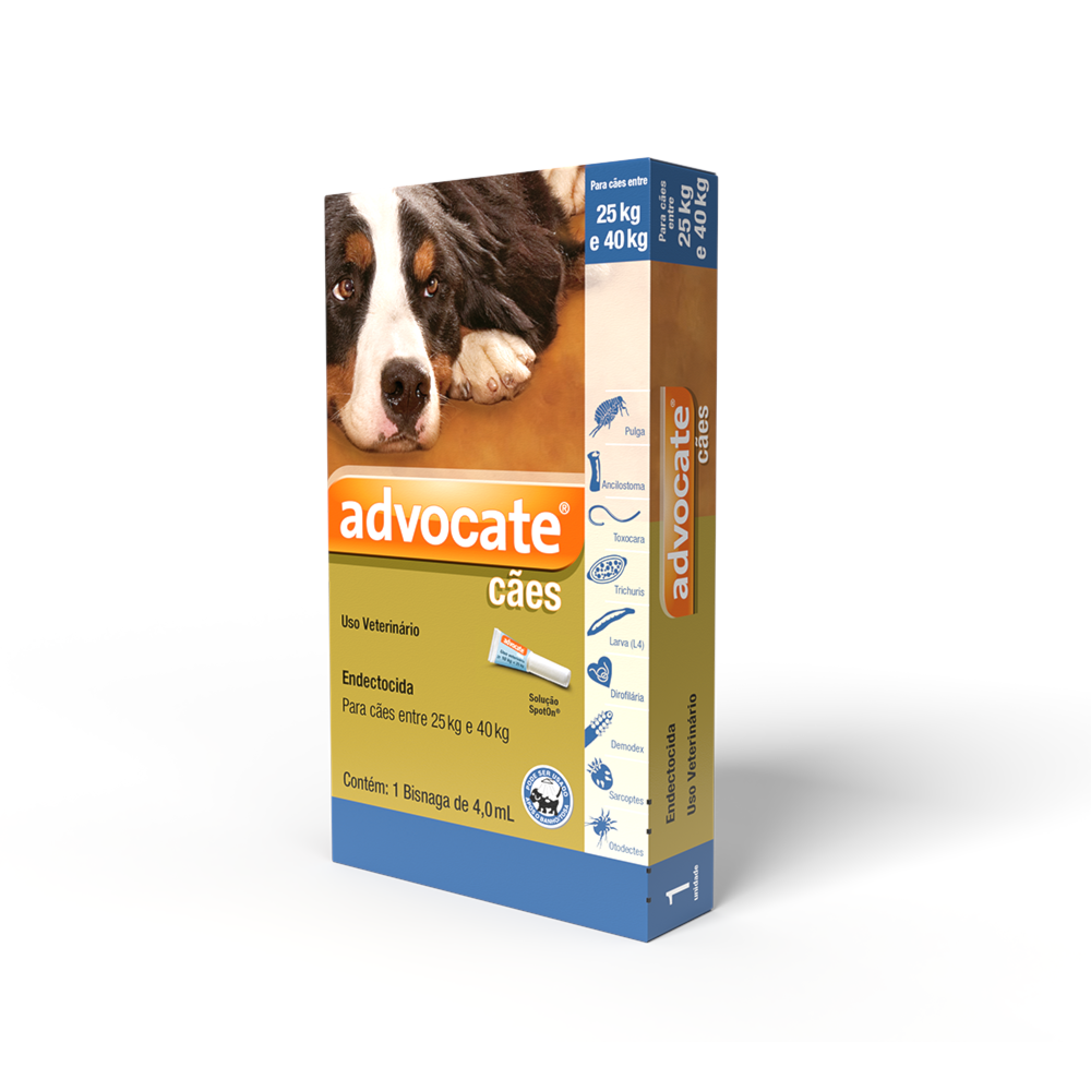 O Antiparasitário Advocate para Cães 25 a 40kg oferece prevenção e tratamento das infestações por pulgas (Ctenocephalides spp.), piolhos (Linognathus setosus e Trichodectes canis), ácaros das sarnas otodécica, sarcóptica e demodécica (Otodectes cynotis, Sarcoptes scabiei e Demodex canis) e os vermes intestinais Ancylostoma caninum, Toxocara canise Uncinaria stenocephala, incluindo suas larvas de quarto estágio (L4) e adultos imaturos; bem como Toxascaris leonina e Trichuris vulpis em cães. Previne também a infestação causada pelo verme cardíaco Dirofilaria immitis quando administrado uma vez por mês.