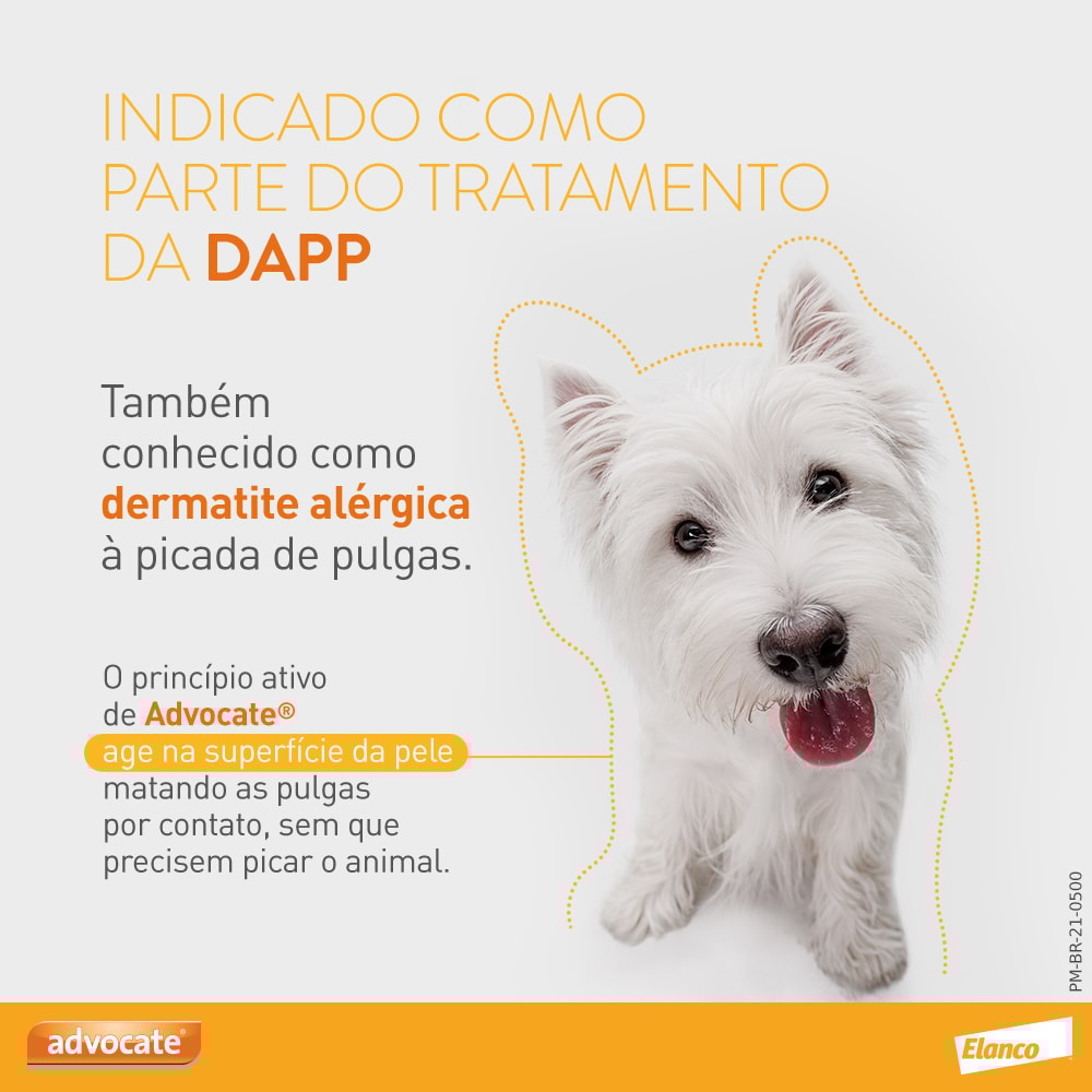Logo no primeiro dia de tratamento o Antiparasitário Advocate para Cães de 4 a 10kgjá elimina as pulgas adultas presentes nos cães, continua eliminando novas pulgas reinfestantes por no mínimo 4 semanas. As novas pulgas, vindas do ambiente ou passeios, morrem após um curto período de contato com a pele do cão já tratado. O tratamento mensal é recomendado para obter-se um controle antipulgas e prevenção ideal. O Antiparasitário Advocate para Cães de 4 a 10kg pode ser usado como parte do tratamento estratégico da dermatite alérgica a picada de pulga.