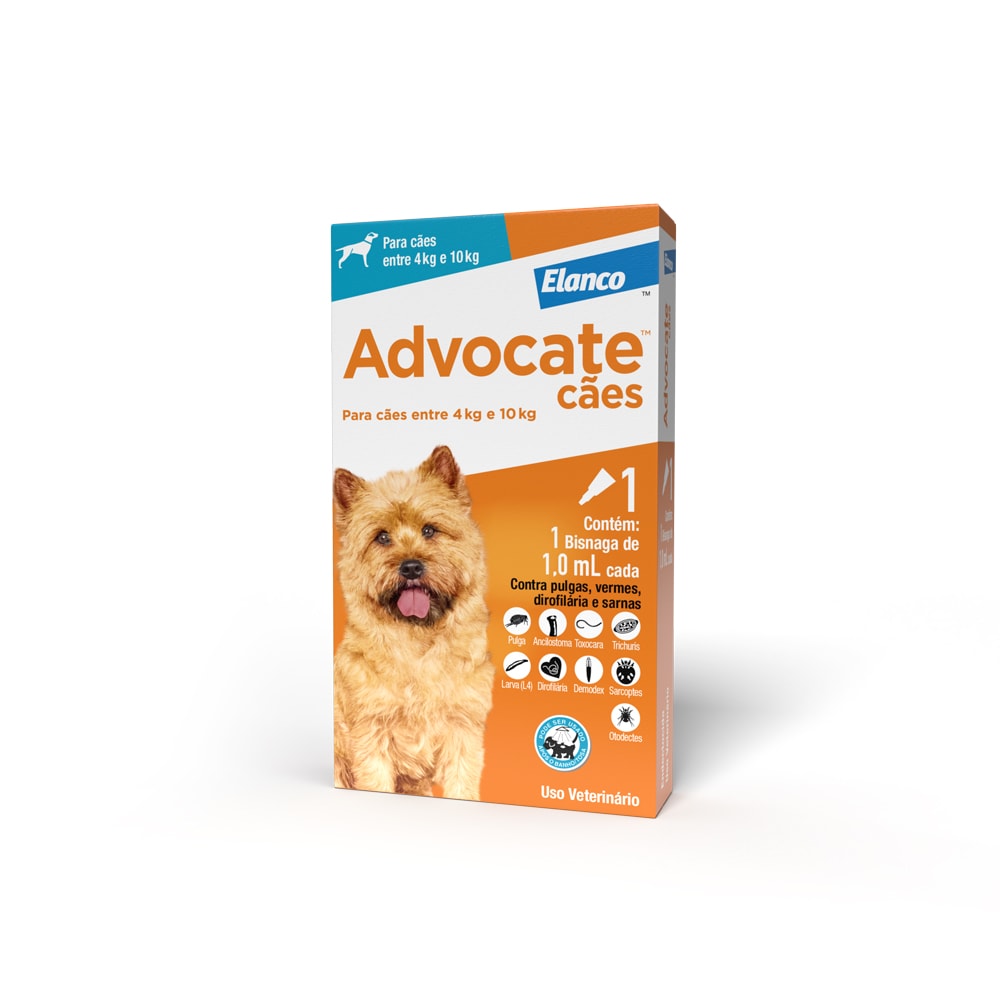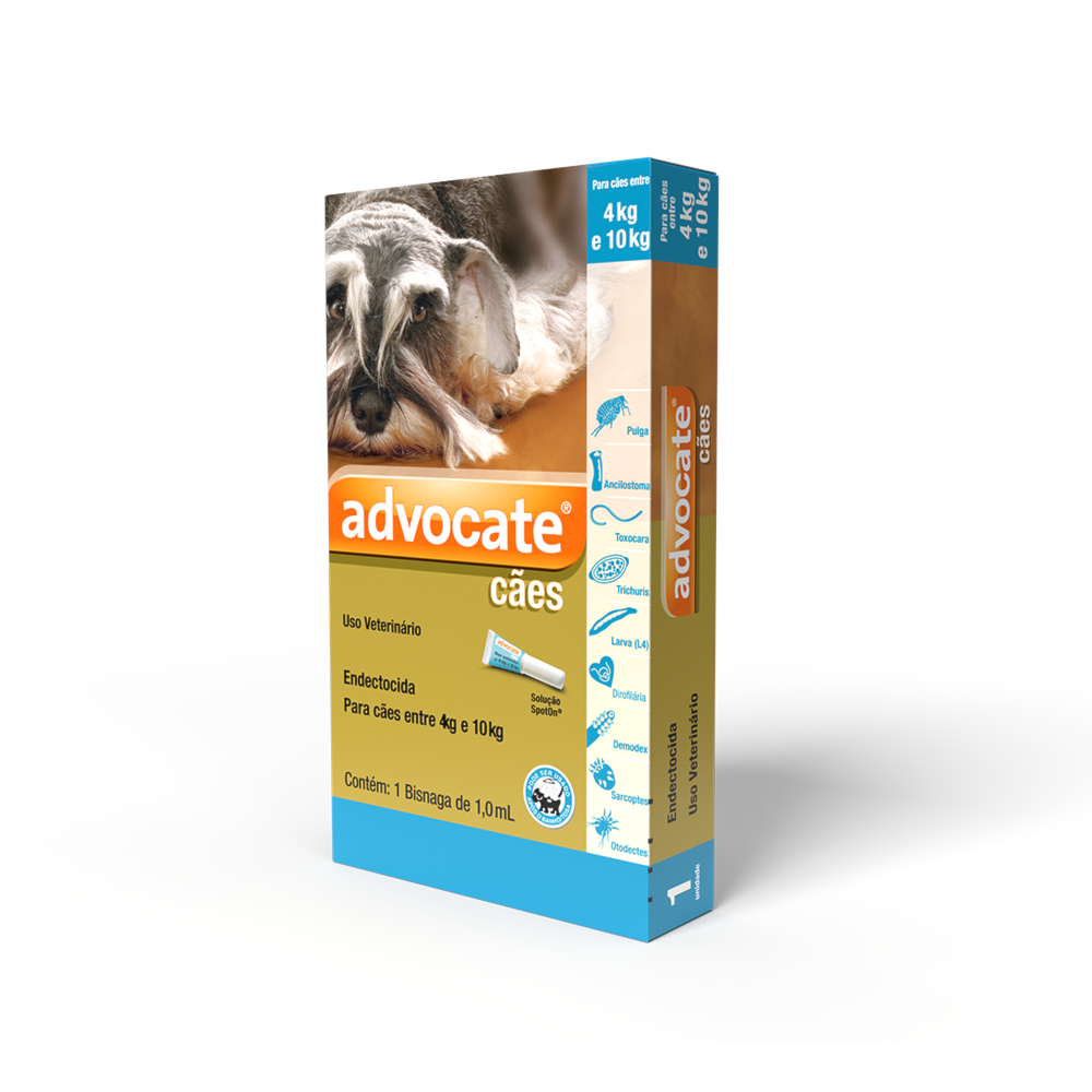 O Antiparasitário Advocate para Cães de 4 a 10kg oferece prevenção e tratamento das infestações por pulgas (Ctenocephalides spp.), piolhos (Linognathus setosus e Trichodectes canis), ácaros das sarnas otodécica, sarcóptica e demodécica (Otodectes cynotis, Sarcoptes scabiei e Demodex canis) e os vermes intestinais Ancylostoma caninum, Toxocara canise Uncinaria stenocephala, incluindo suas larvas de quarto estágio (L4) e adultos imaturos; bem como Toxascaris leonina e Trichuris vulpis em cães. Previne também a infestação causada pelo verme cardíaco Dirofilaria immitis quando administrado uma vez por mês.
