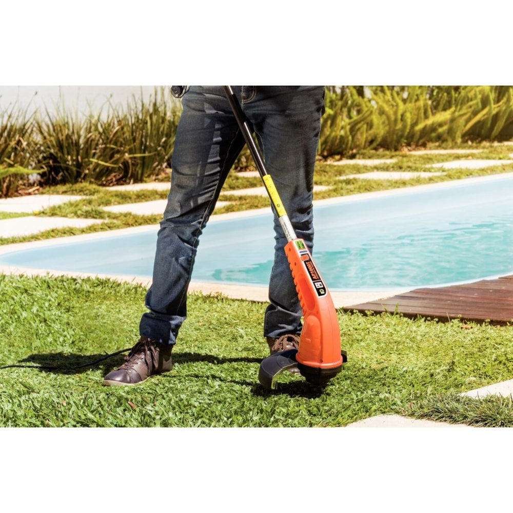 - DURANTE O USO: Durante o trabalho, use sempre calçados fechados e óculos de segurança. Não levante o aparador. Se isso for necessário, faça-o de forma que o fio de nylon fique do lado oposto ao operador. Procure conduzir o cabo elétrico por trás do aparador e sempre pelo lado já cortado da grama. Nunca trabalhe com o aparador sob chuva ou em gramados molhados e utilize-o sempre durante o dia ou com boa iluminação.