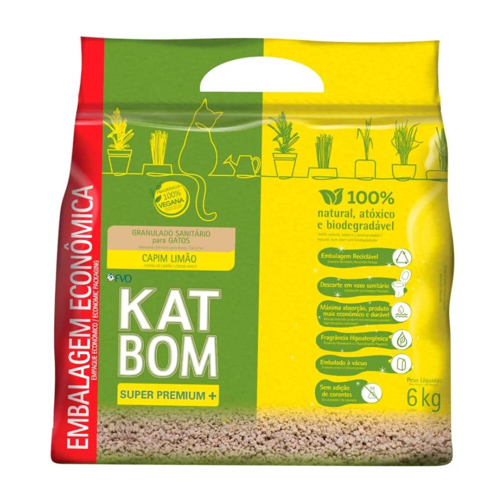 Detalhes do Produto KATBOM é o granulado sanitário natural de qualidade superior, especialmente desenvolvido para a higiene dos gatos. Com o granulado KATBOM você elimina vários problemas causados pelas areias higiênicas comuns, onde a urina escorre para o fundo da caixa sanitária, dificultando sua limpeza e permitindo proliferação de bactérias, responsáveis pelos odores desagradáveis. Por ser natural e à base de matéria orgânica, você pode eliminar o granulado KATBOM via vaso sanitário, sem problemas de entupimento de encanamentos ou fossas.