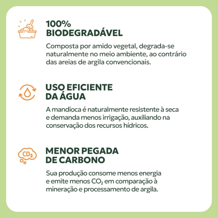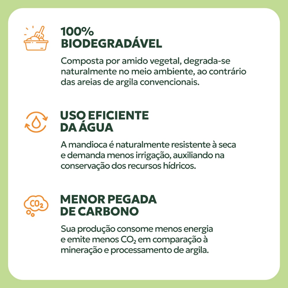 Por ser biodegradável, o granulado pode ser descartado de maneira mais ecológica — em lixo orgânico ou compostagem, conforme as normas locais. Uma solução prática e amiga do planeta.
