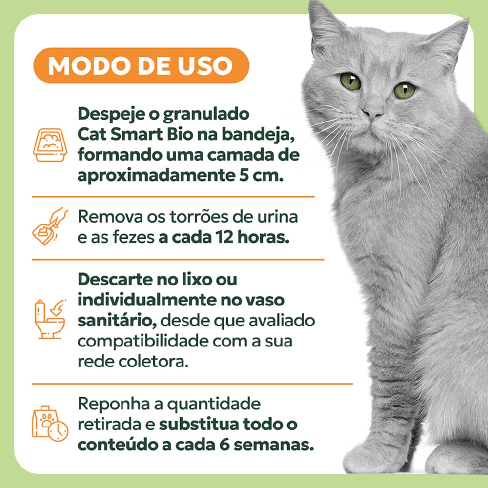 Para gatos que ainda não utilizam granulados vegetais, recomenda-se misturar gradualmente o Cat Smart Bio com a areia tradicional, aumentando a proporção até a completa adaptação.