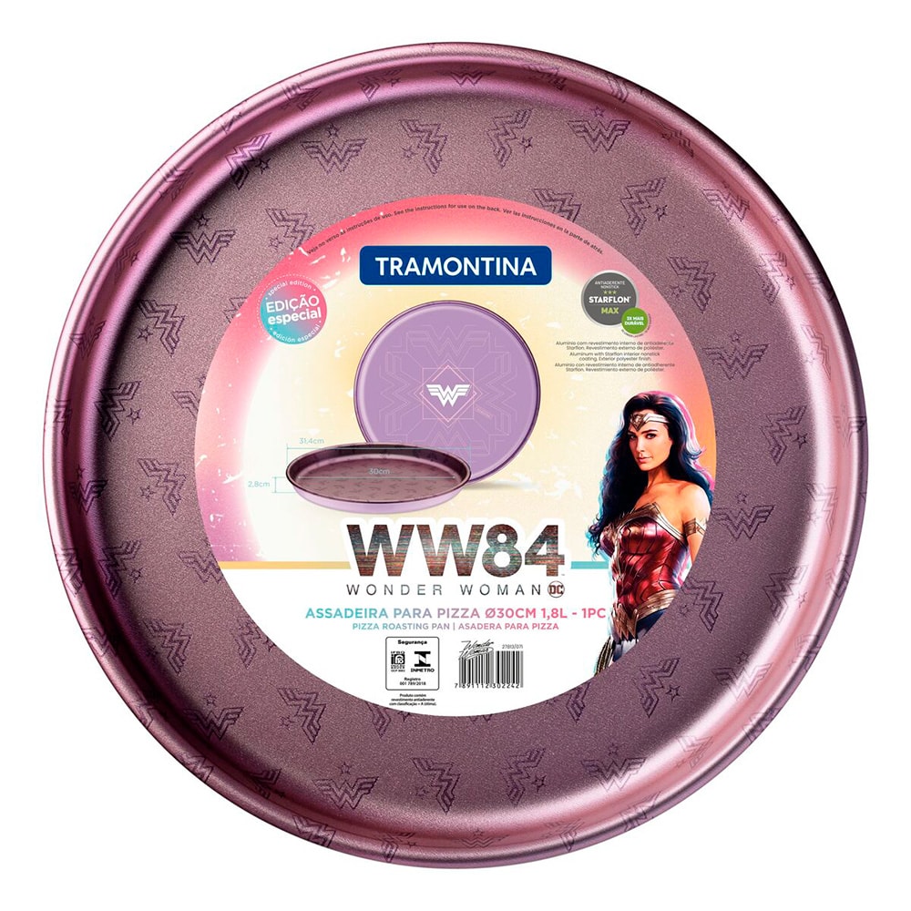 Detalhes do Produto A assadeira para pizza Tramontina Mulher-Maravilha 1984 em alumínio com revestimento interno em antiaderente Starflon Max e externo de poliéster roxo suave 30 centímetros 1,8 litros vai lhe proporcionar momentos deliciosos saboreando pizzas incríveis. Seja qual for o sabor, ela é perfeita para assá-las de maneira uniforme e rápida, pois conta com corpo produzido em alumínio com espessura de 1,0 milímetro. Internamente, ela é revestida de antiaderente Starflon Max, atributo que evita que os alimentos grudem em sua superfície e devido a isso, muito fácil de limpar e não prejudicial sua saúde. Ela vem com revestimento externo em poliéster na linda cor roxo suave e é resistente e durável. Assistir o filme da heroína comendo aquela pizza deliciosa e na companhia da Tramontina, é tudo de bom!