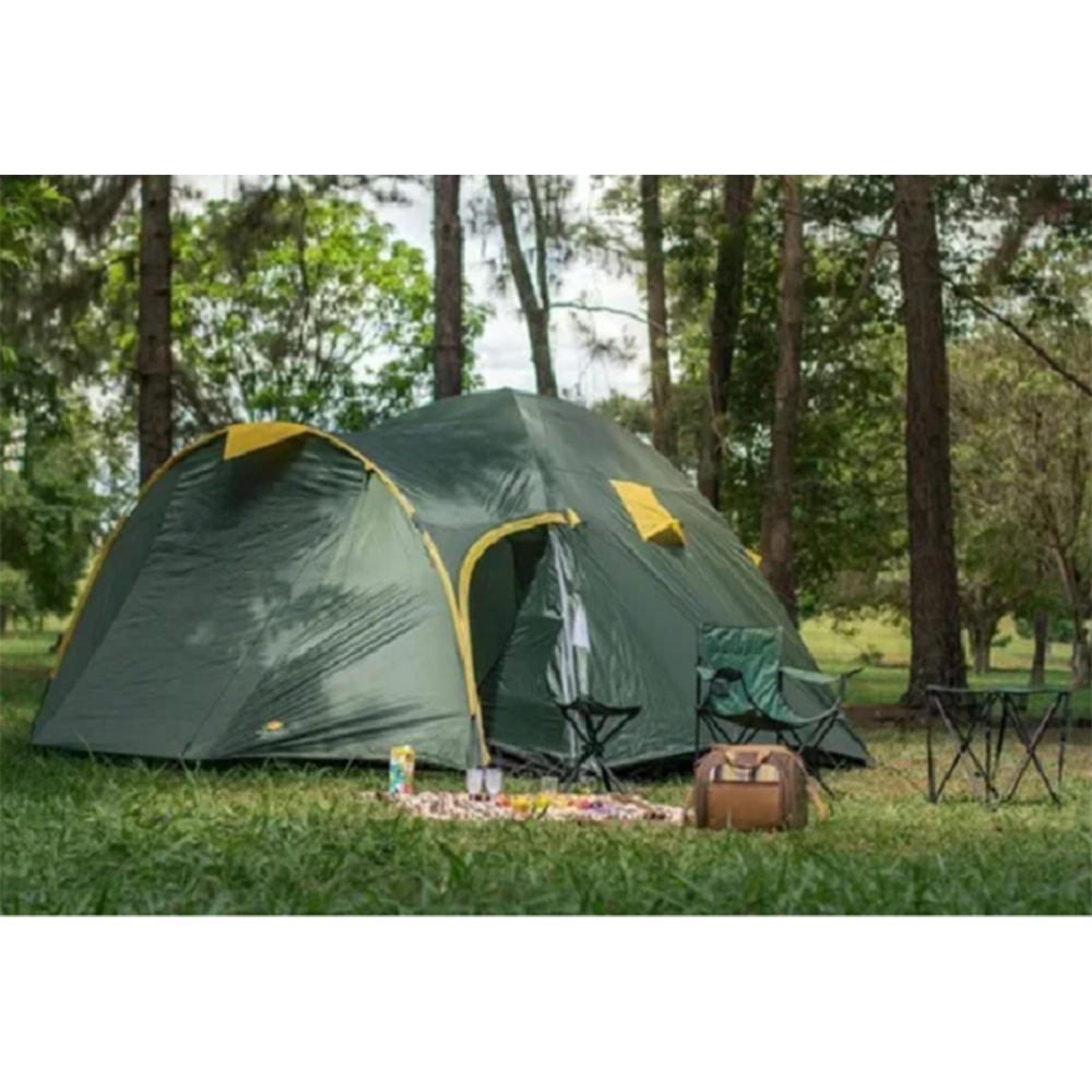 Detalhes do Produto A Barraca Zeus Guepardo para 5 pessoas com a estrutura e o tamanho ideal para que você possa desfrutar de ótimos momentos no camping ao lado da sua família e amigos. Fabricada em poliéster 190T high quality, a barraca Zeus possui piso em polietileno de alta densidade (antifungo) e tela mesh no see um, que evita que até os menores insetos possam entrar na barraca, fazendo com que toda a família possa ter uma noite tranquila e sossegada de sono. Oferece amplo espaço interno, que acomoda com tranquilidade e conforto os ocupantes, além de proporcionar maior privacidade e segurança. Entre as suas características, a Zeus possui varetas em fibras de vidro, porta interna dupla em poliéster + mosquiteiro e 2 porta objetos internos, que facilita a organização dos seus itens pessoais.