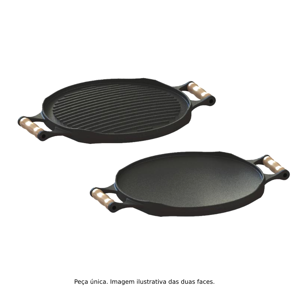 Bifeteira Chapa Redonda Dupla Face Ferro Fundido com Alça de Madeira Fundição Libaneza 33cm Cod. 93726