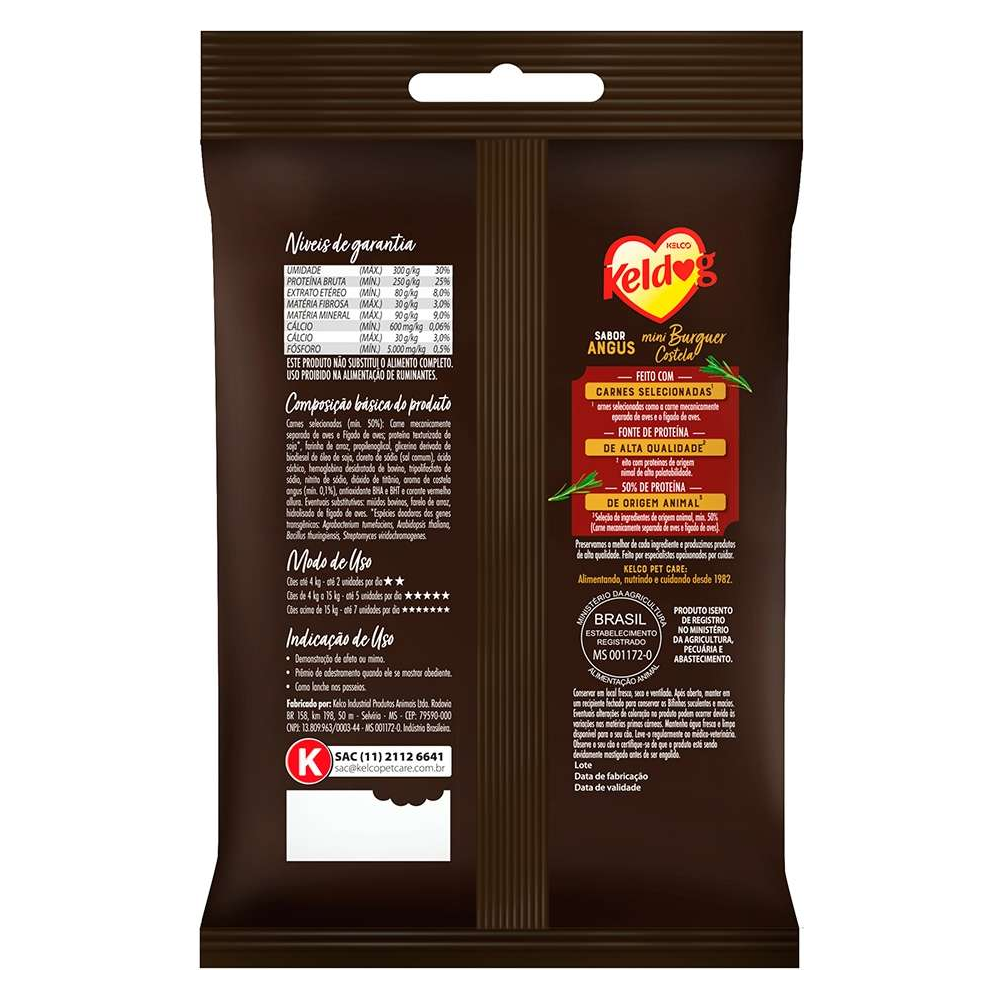O Bifinho Keldog Mini Hambúrguer Costela Angus 60g é um petisco inovador e delicioso que simula um mini hambúrguer, feito com ingredientes selecionados e de alta qualidade para agradar o paladar exigente do seu cãozinho.