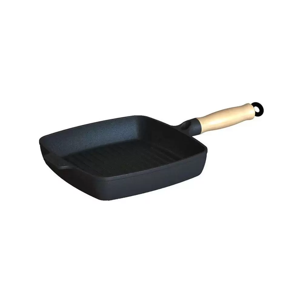 Material: Ferro fundido com cabo de madeira Ideal para Grelhas com Perfeição Com sua superfície estriada e capacidade de distribuição uniforme de calor, esta frigideira é perfeita para grelhar carnes, legumes e diversos outros alimentos, garantindo resultados deliciosos e saudáveis a cada preparo. Instruções de Uso e Cuidados Para garantir a durabilidade e o desempenho da sua frigideira, siga estas recomendações de uso e cuidados: