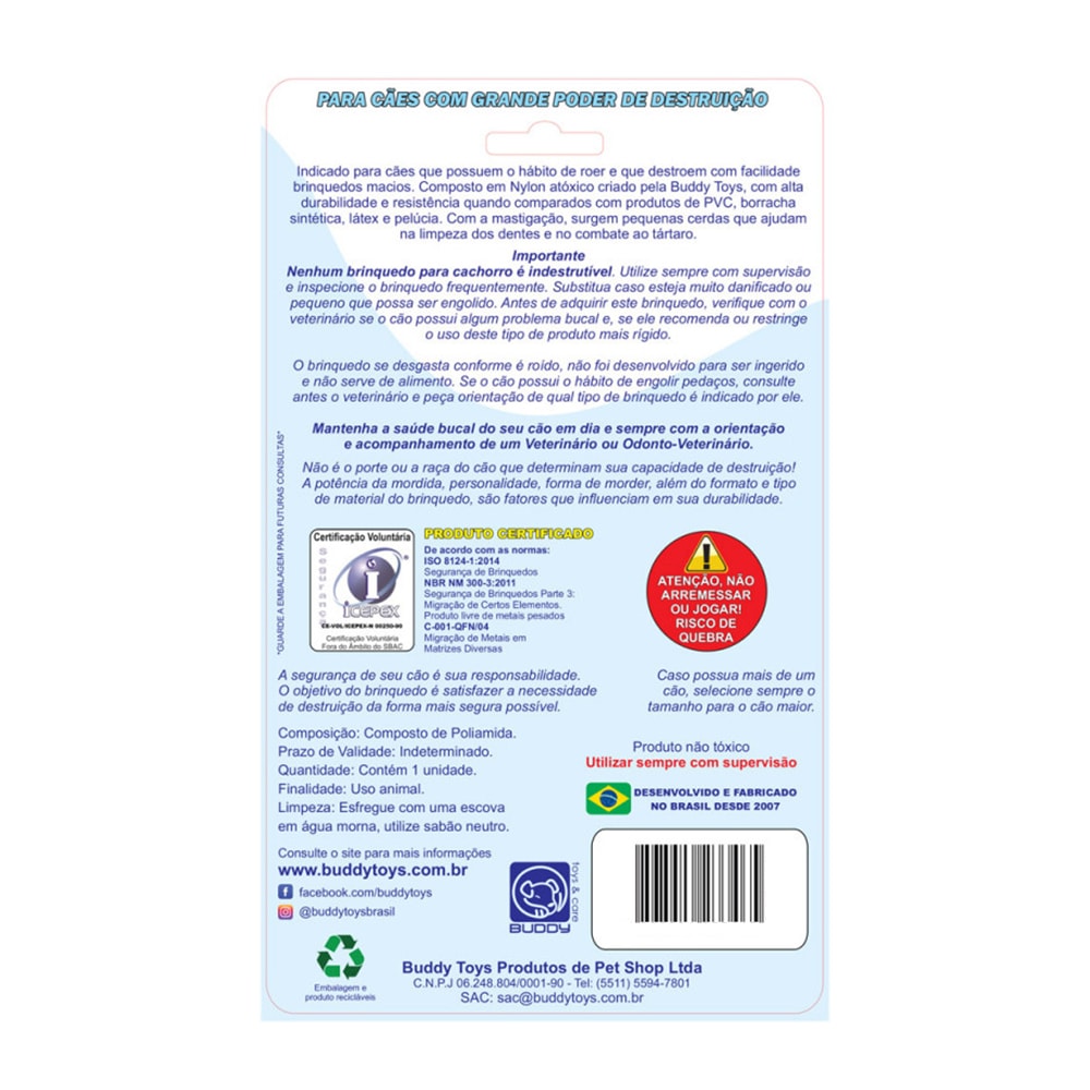 Importante: Todos os modelos da linha Buddy Nylon possuem o mesmo composto exclusivo da Buddy Toys, que os cães adoram. Cada animal tem seu jeito de brincar e roer, por isso a durabilidade não é a mesma. Entretanto, todos possuem uma grande resistência quando comparados por exemplo, com brinquedos feitos de PVC, Látex, plásticos de baixa qualidade ou borrachas sintéticas. É importante ressaltar que não serve de alimento! O brinquedo não foi desenvolvido com o objetivo de ser ingerido. Se o seu cão costuma ingerir objetos, consulte um veterinário. Se tiver dúvidas sobre o atual estado da saúde bucal do seu cão ou de como o brinquedo pode agir, procure um veterinário e mantenha em dia o acompanhamento com o profissional.