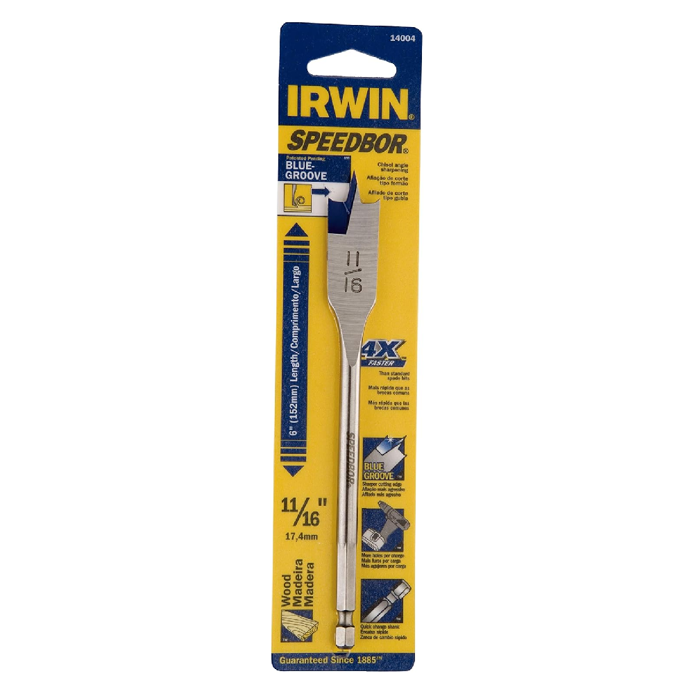 A Broca Chata para Madeira 11/16 x 6" da Irwin é uma ferramenta de alta qualidade, projetada especificamente para perfurar madeira e materiais similares. Com diâmetro de 11/16 de polegada (aproximadamente 17mm) e comprimento total de 6 polegadas (152mm), essa broca é ideal para uma variedade de aplicações na marcenaria, carpintaria e outros trabalhos em madeira.