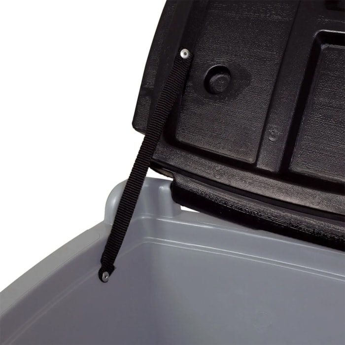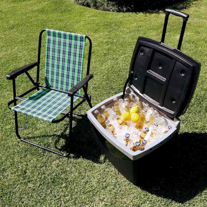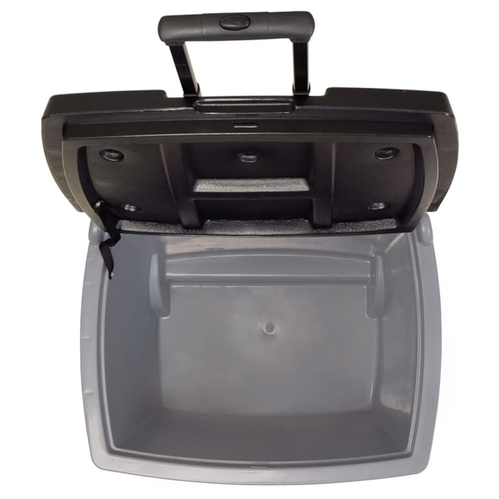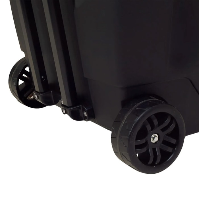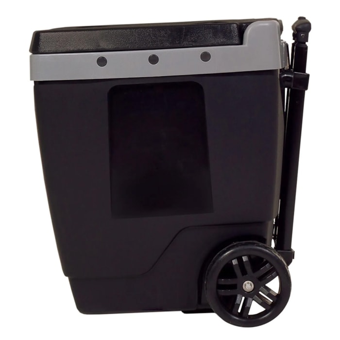 A alça retrátil com três níveis de altura e as rodas largas de rolagem suave oferecem mobilidade total, permitindo o transporte fácil mesmo em terrenos irregulares. Sua tampa articulada, fixada à estrutura, evita o contato com o chão e conta com quatro porta-copos integrados, agregando ainda mais praticidade durante o uso.