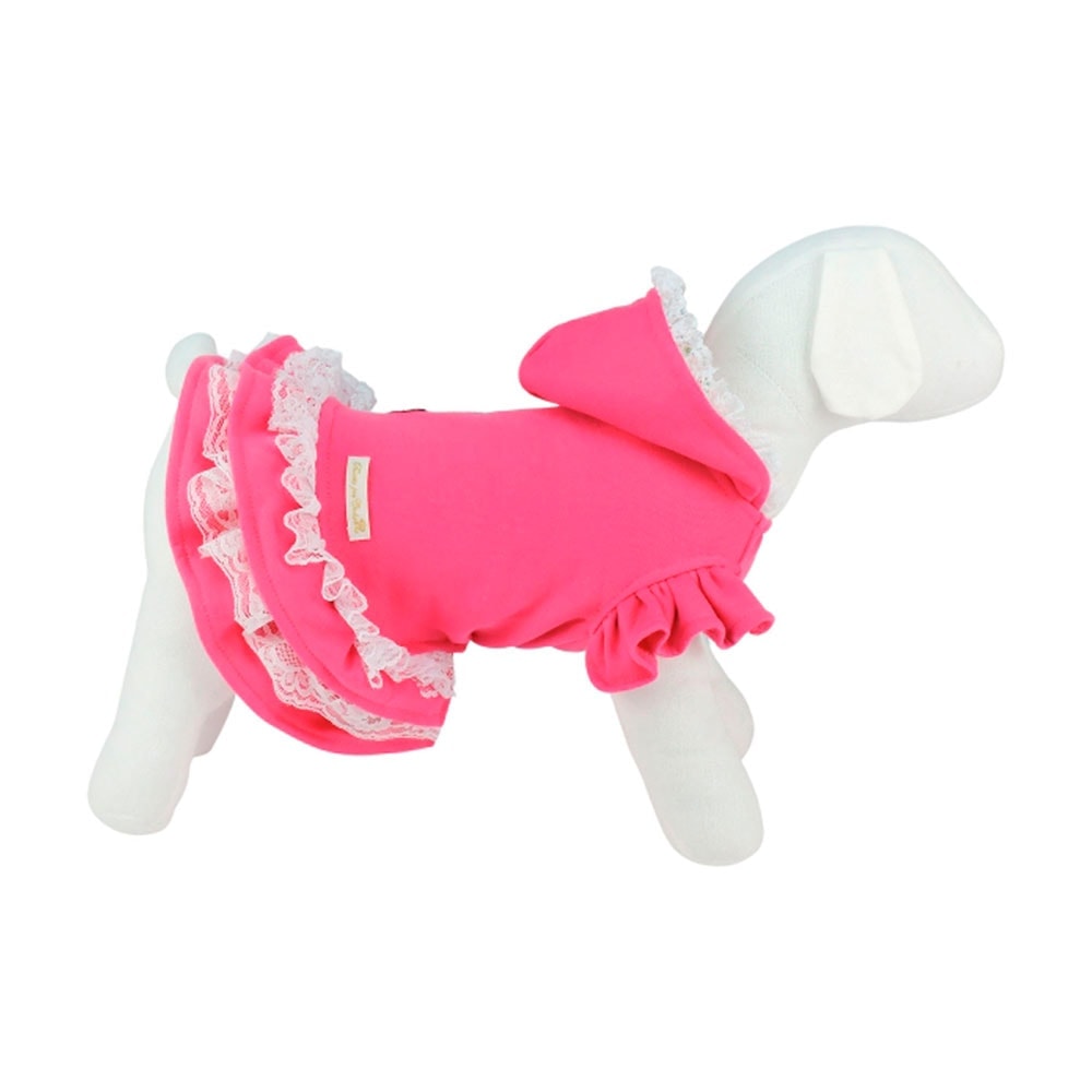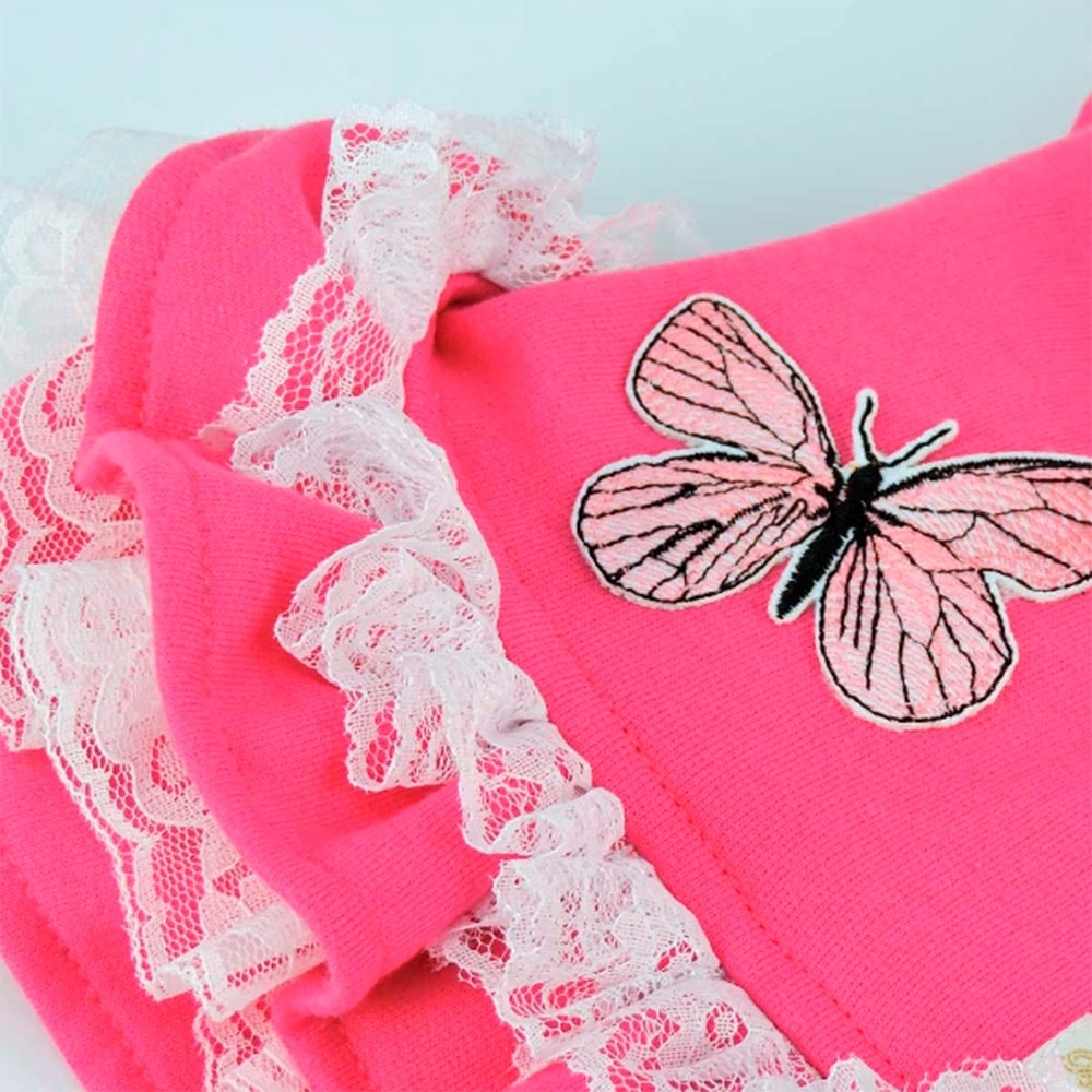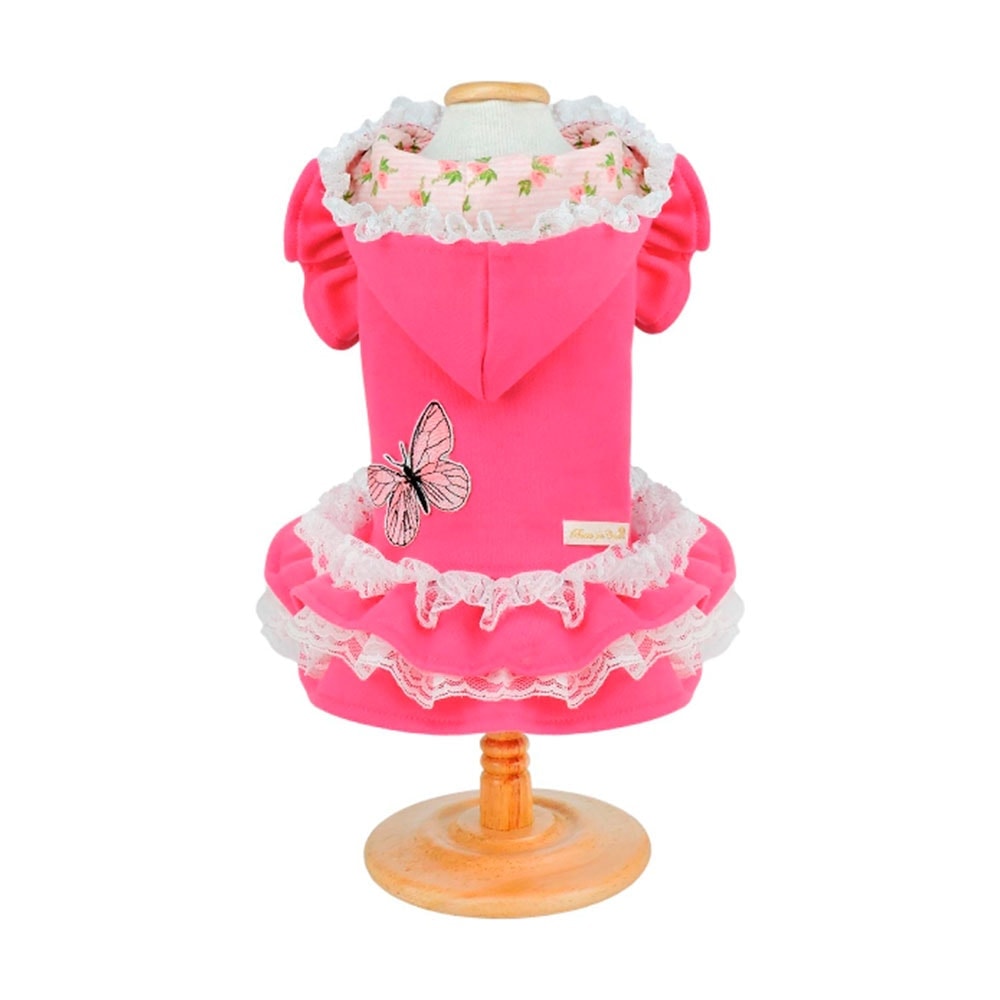O Casaco Borboleta Pink com Capuz da Bonito pra Cachorro é uma peça delicada, com estilo romântico bem representada pelos babadinhos e o detalhe floral e rendas do capuz.