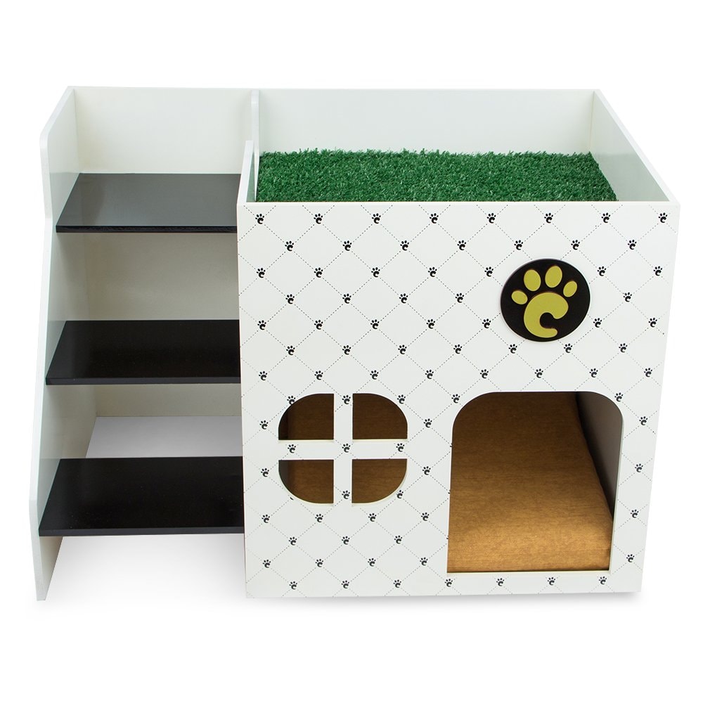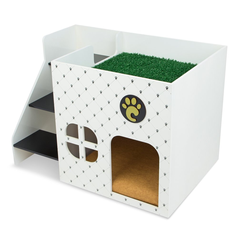Casinha de Luxo Confeccionada em M.D.F, possui dois andares com uma luxuosa cobertura com graminha sintética ou almofada de tecido. É ideal para cães de raças pequenas.
