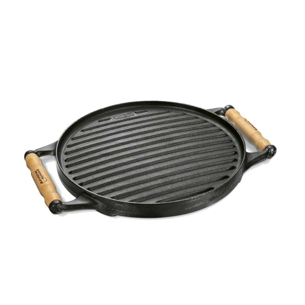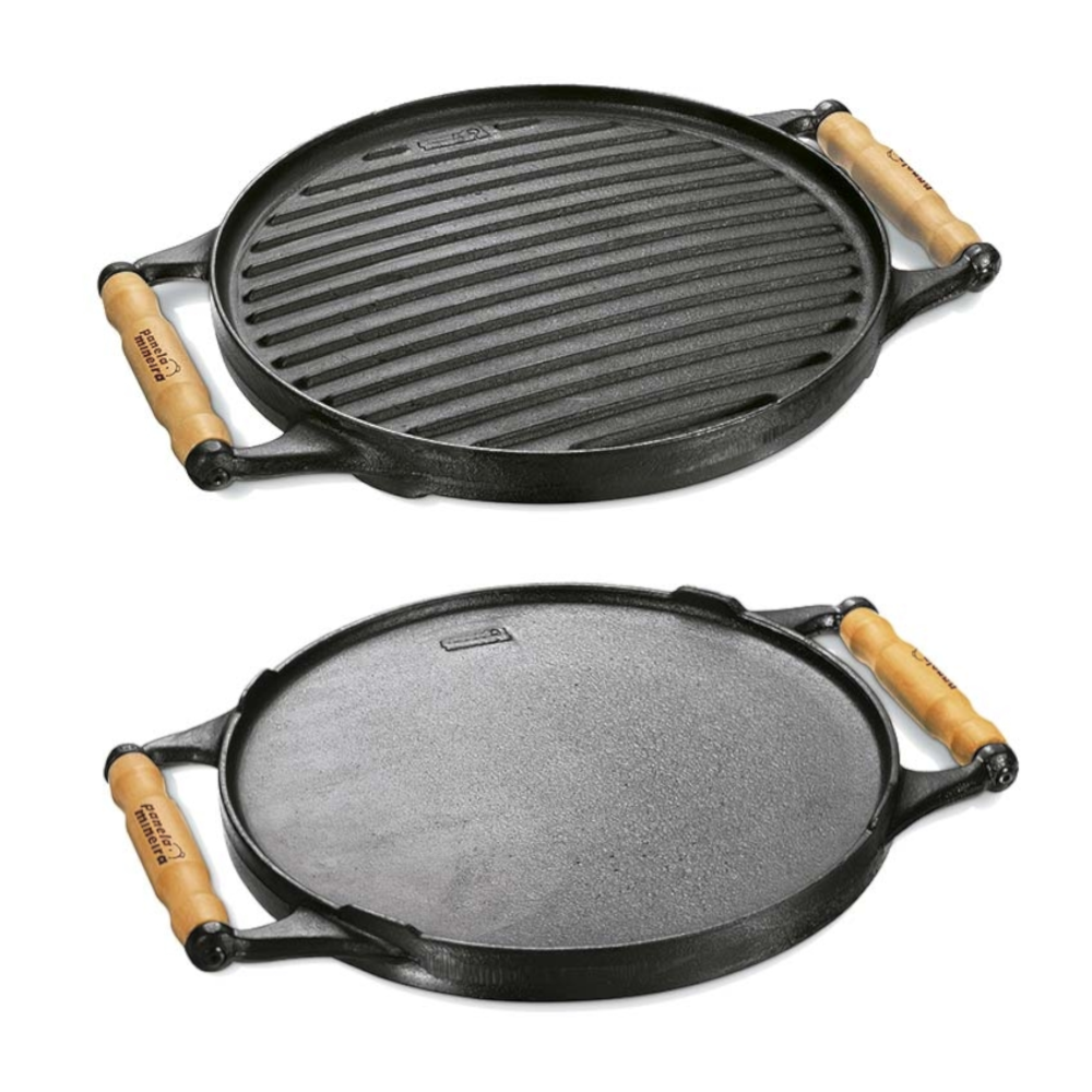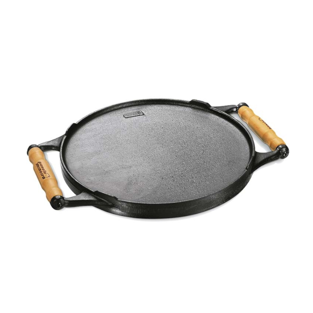 Chapa de ferro fundido dupla-face com 30 cm diâmetro, Pode ser utilizada dos 02 lados sendo que um dos lados tem a chapa toda lisa e o outro lado a chapa é estriada para preparar grelhados. Pode ser utilizada em qualquer tipo de fogão (gás, elétrico, lenha, cerâmico e indução).
