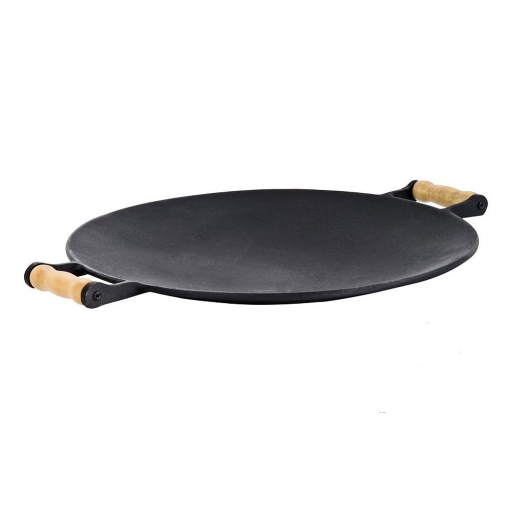 Chapa de ferro Disco Côncava com 45 cm diâmetro com alças de madeira. Medida não inclui as alças que medem 4,5 cm de cada lado. Essa chapa possui inclinação e o centro é mais fundo que as bordas, o design desta chapa de ferro fundido foi inspirado no disco de arado (implemento agricola) frequentemente improvisado como chapa. Essa chapa apresenta inúmeras vantagens com relação ao disco de arado pois não tem solda, é mais espesso, mais resistente, atinge temperaturas maiores, conserva a temperatura por mais tempo.