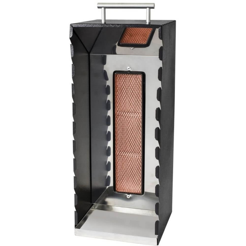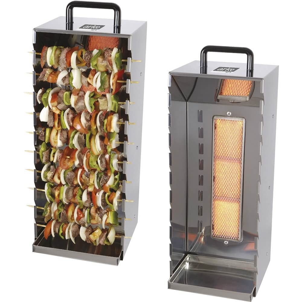 Assador de espetinhos a gás em aço carbono com pintura epóxi.