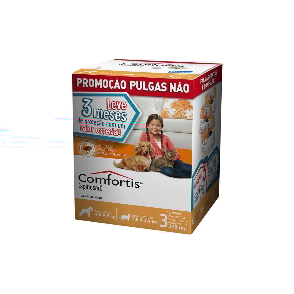 O Antipulgas Elanco Comfortis para Cães e Gato oral começa a agir 30 minutos depois de ingerir o tablete mastigável, 24 horas depois, elas somem completamente, e por ser administrado via oral, Comfortis permite que seu cão brinque, ganhe abraços e até tome banho, sem que nada interfira no tratamento, é uma solução inovadora que vai mudar a forma de manter seu cão livre de pulgas. Comfortis é um tablete mastigável que tem modo de ação inédito, com seu princípio ativo (spinosad) tem sua eficiência pela ligação nos sítios nervosos da pulga, levando-o a paralisia e morte em poucos minutos.
