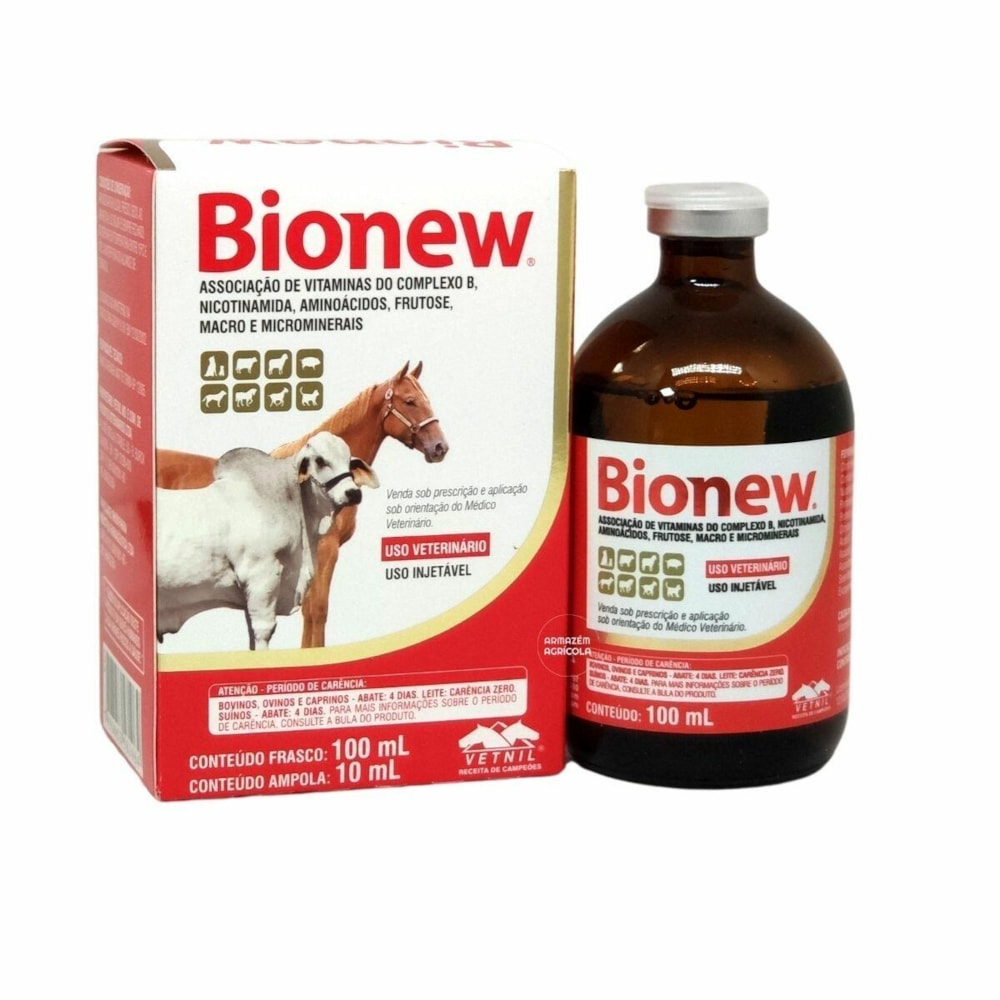 Bionew 100 mL é um suplemeto vitamínico indicado para Bovinos, Cães , Equinos, Ovinos, Caprinos e Suínos para auxliar no ganho de peso. Com Bionew seu animal tera um rendimento a mais em sua produção.