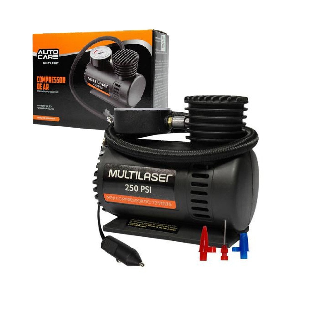 Detalhes do Produto Com o compressor de ar Multilaser você tem a possibilidade de encher o pneu do seu automóvel a qualquer hora. Possui um conector de entrada compatível com o acendedor de cigarro, além de contar com 3 adaptadores para encher bolas, balão e pequenos produtos infláveis. Além de compacto, possui a capacidade de pressão de até 250PSI com um marcador de pressão (manômetro). O Compressor de Ar da Multilaser é sinônimo do melhor valor do mercado e benefício, feito especialmente para você!