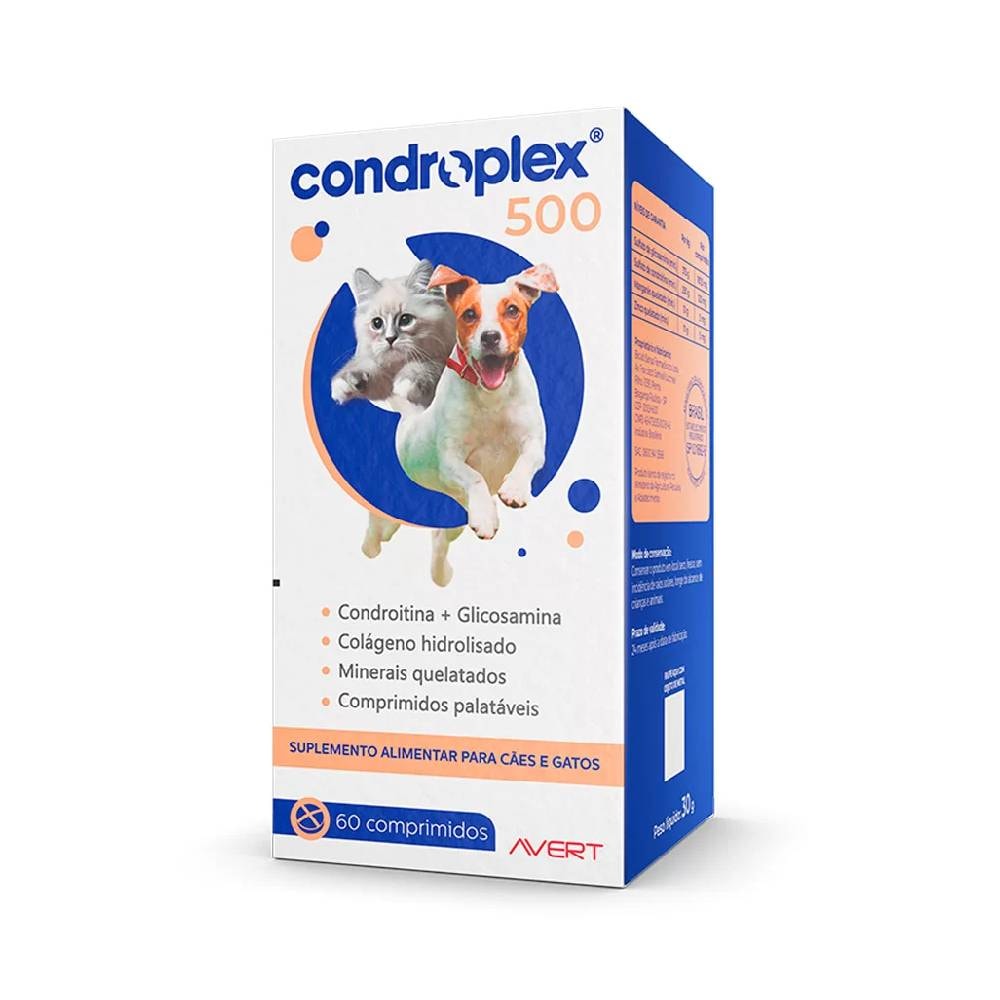 Condroplex 500 comprimidos é um suplemento alimentar composto por nutrientes essenciais às articulações, indicado para gatos e cães de pequeno porte em qualquer idade.