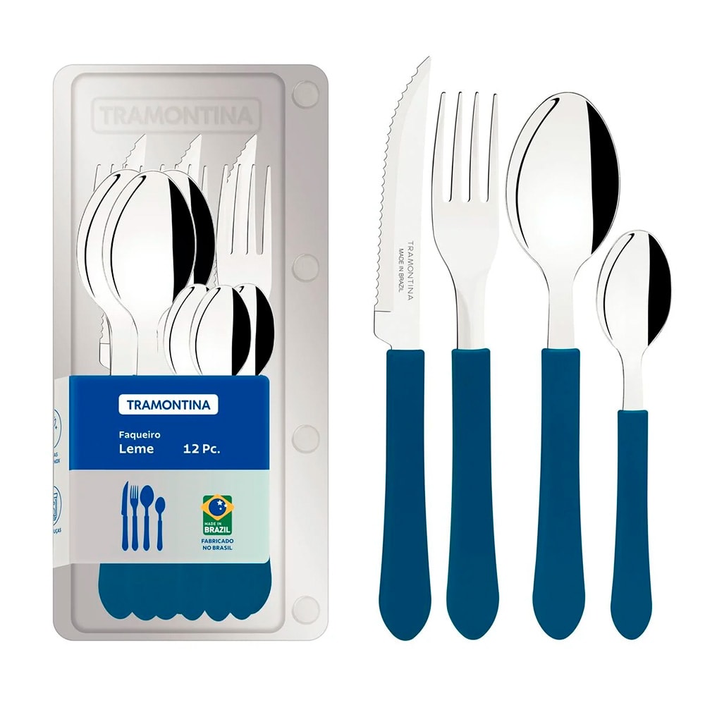 Detalhes do Produto Cor, alegria e vivacidade para suas refeições com o faqueiro Tramontina Leme, com lâminas em aço inox e cabos de polipropileno azul, contendo 12 peças. Desenvolvido para uso no dia a dia, suas peças têm produção em materiais que garantem sua qualidade, resistência e durabilidade: lâminas em aço inox e cabos de polipropileno. Com estampagem e espessura especiais, seus garfos e colheres garantem maior resistência e durabilidade, e suas facas, com tratamento térmico na lâmina, possuem alto poder de corte. Tudo isso para garantir o melhor para sua mesa. Os talheres ainda são muito fáceis de limpar e podem ir à máquina de lavar louças, otimizando sua rotina na cozinha!