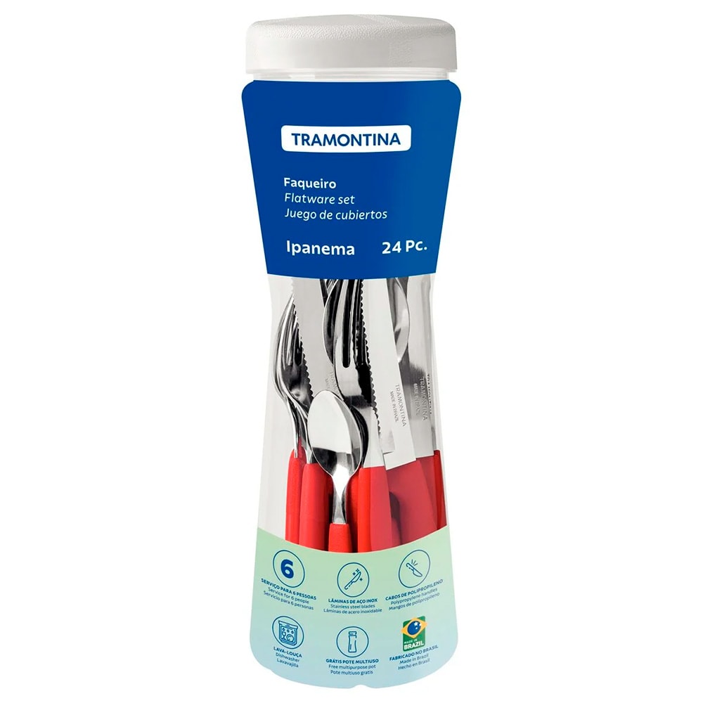 Detalhes do Produto Que tal acrescentar cor e alegria ao seu dia a dia? Com o Faqueiro Tramontina Ipanema com Lâminas em Aço Inox e Cabos de Polipropileno Vermelho com Pote Plástico 24 Peças seus momentos de descontração à mesa estarão garantidos. Com ele, você terá muita versatilidade e qualidade para todas as suas refeições, pois suas peças são produzidas com lâminas em aço inox e cabos em polipropileno, características que garantem alta resistência e durabilidade. Ele ainda acompanha um pote plástico, perfeito para armazenar suas peças ou alimentos como macarrão ou outros grãos. Leve toda essa praticidade para sua casa e conte com a qualidade Tramontina!