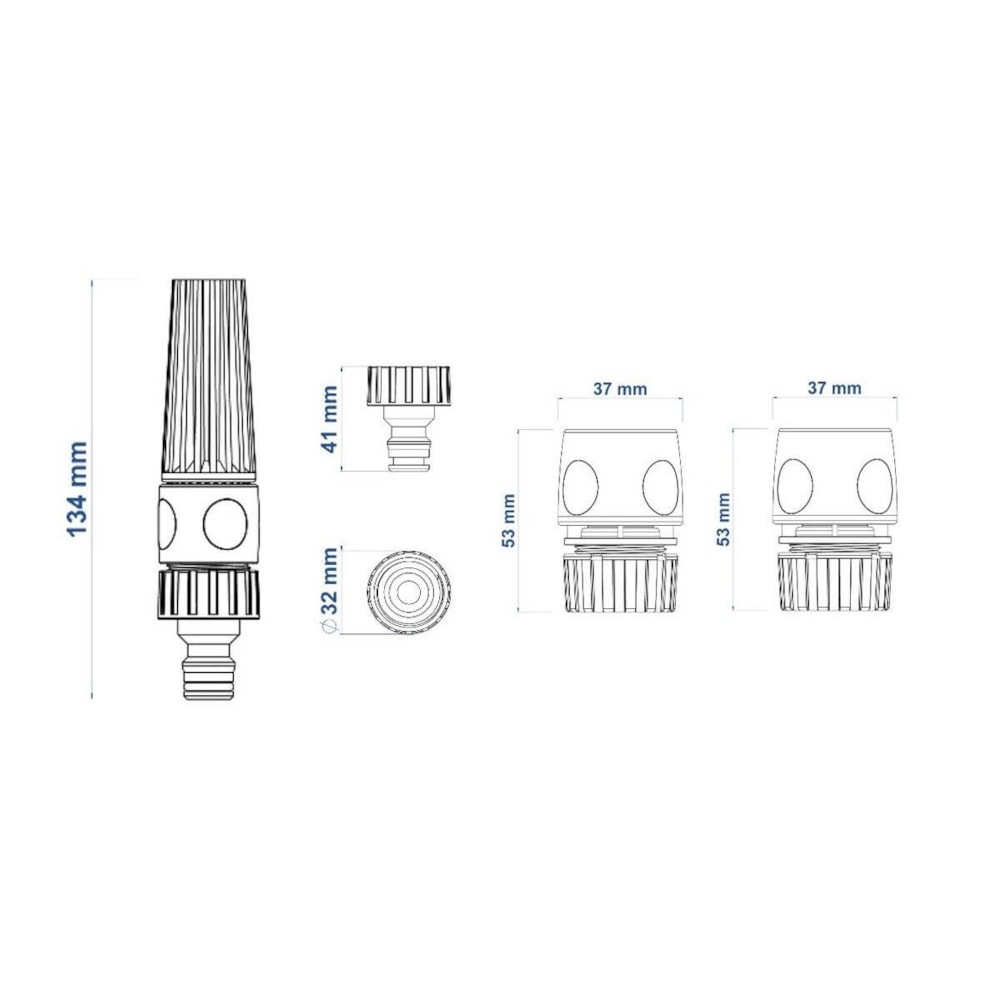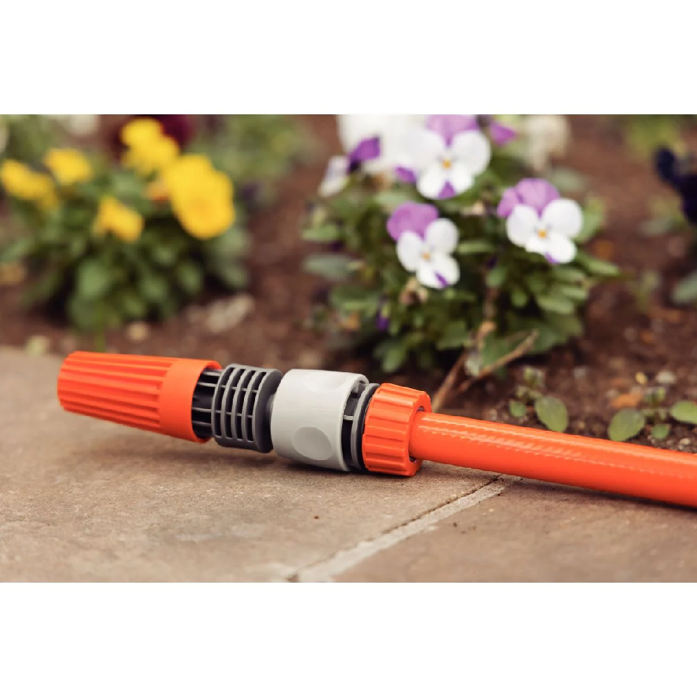 O esguicho é conectado em mangueiras de 1/2", 5/8" e 3/4" através de sistema de engate rápido.
