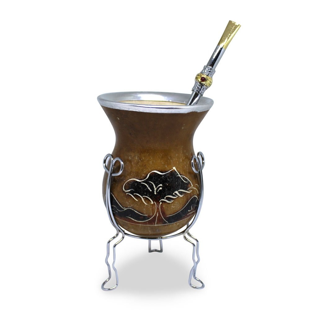 Conjunto para Chimarrão fabricado artesanalmente. Possui cuia de porongo natural polida com gravação artesanal e bocal em alumínio, bomba fabricada em metal cromado com chupeta dupla e botão em banho dourado, bojo e cano redondo e base fabricada em metal cromado de alta resistência.