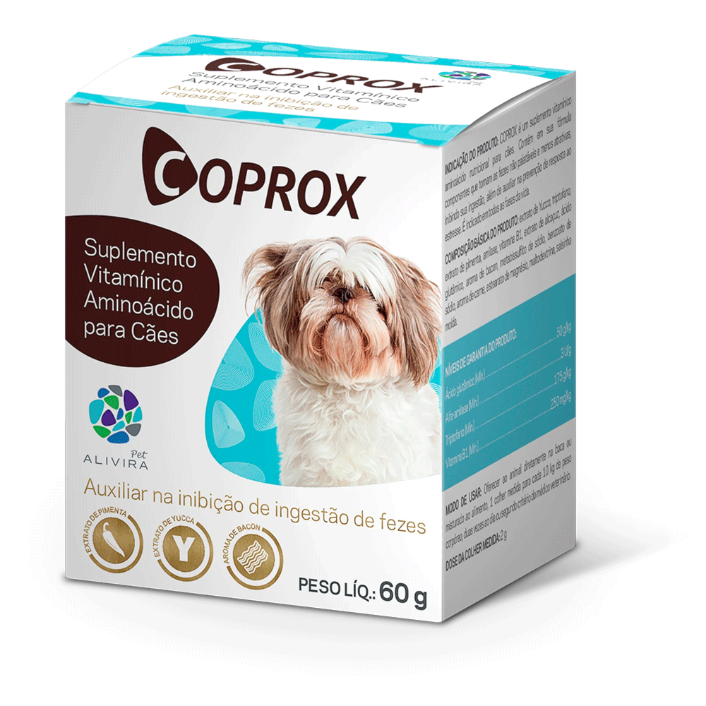 Coprox é um suplemento vitamínico e aminoácido de uso oral, desenvolvido para inibir a coprofagia (hábito de ingestão de fezes) em cães. Sua fórmula contém ingredientes que tornam as fezes não palatáveis e menos atrativas, além de atuar como auxiliar na prevenção de respostas ao estresse. É indicado para cães de todas as idades e portes.
