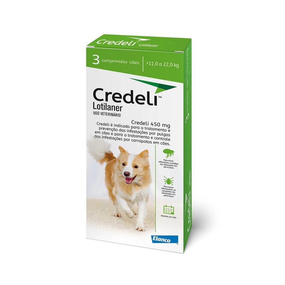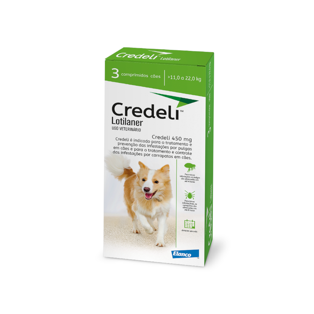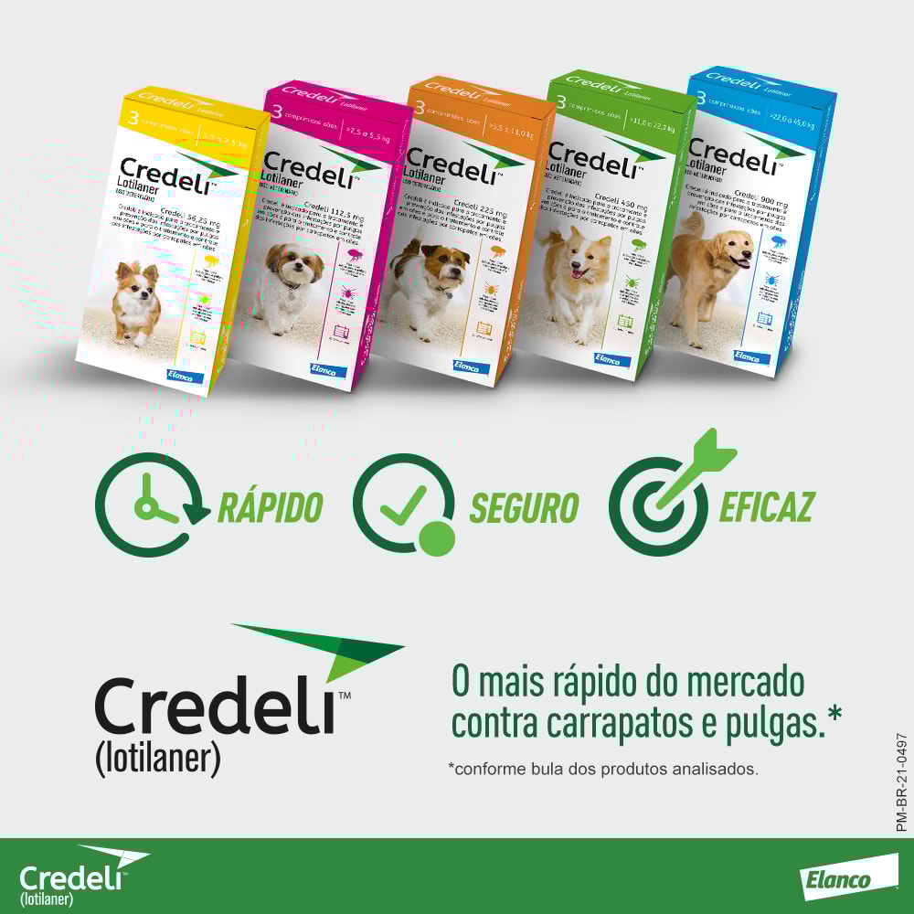 Credeli™ é o comprimido anti carrapatos e antipulgas mais rápido do mercado para cães, com uma molécula própria desenvolvida para essa espécie. Começa a eliminar carrapatos em 4 horas com eliminação de 100% em 8 horas, e pulgas a ação inicia em até 2 horas com eliminação completa em 6 horas! Além de ser o mais rápido do mercado, sua fórmula exclusiva também combate o Amblyomma Cajennense, mais conhecido como carrapato-estrela, causador da febre maculosa. Credeli™ é o único do mercado que possui essa indicação em bula.