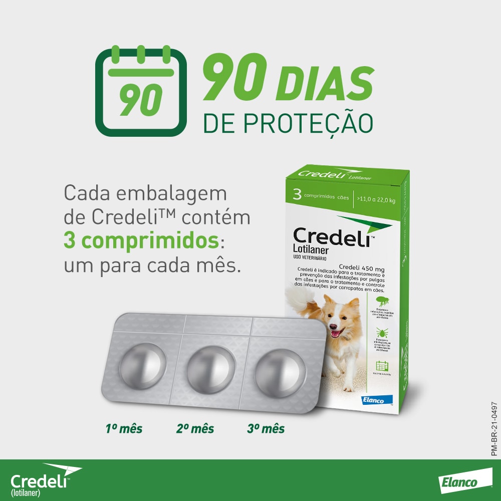 Credeli™ pode ser administrado em filhotes a partir de 1,3kg e 8 semanas de idade. Cada embalagem de Credeli™ contém 3 comprimidos, garantindo 90 dias de proteção para o seu pet!