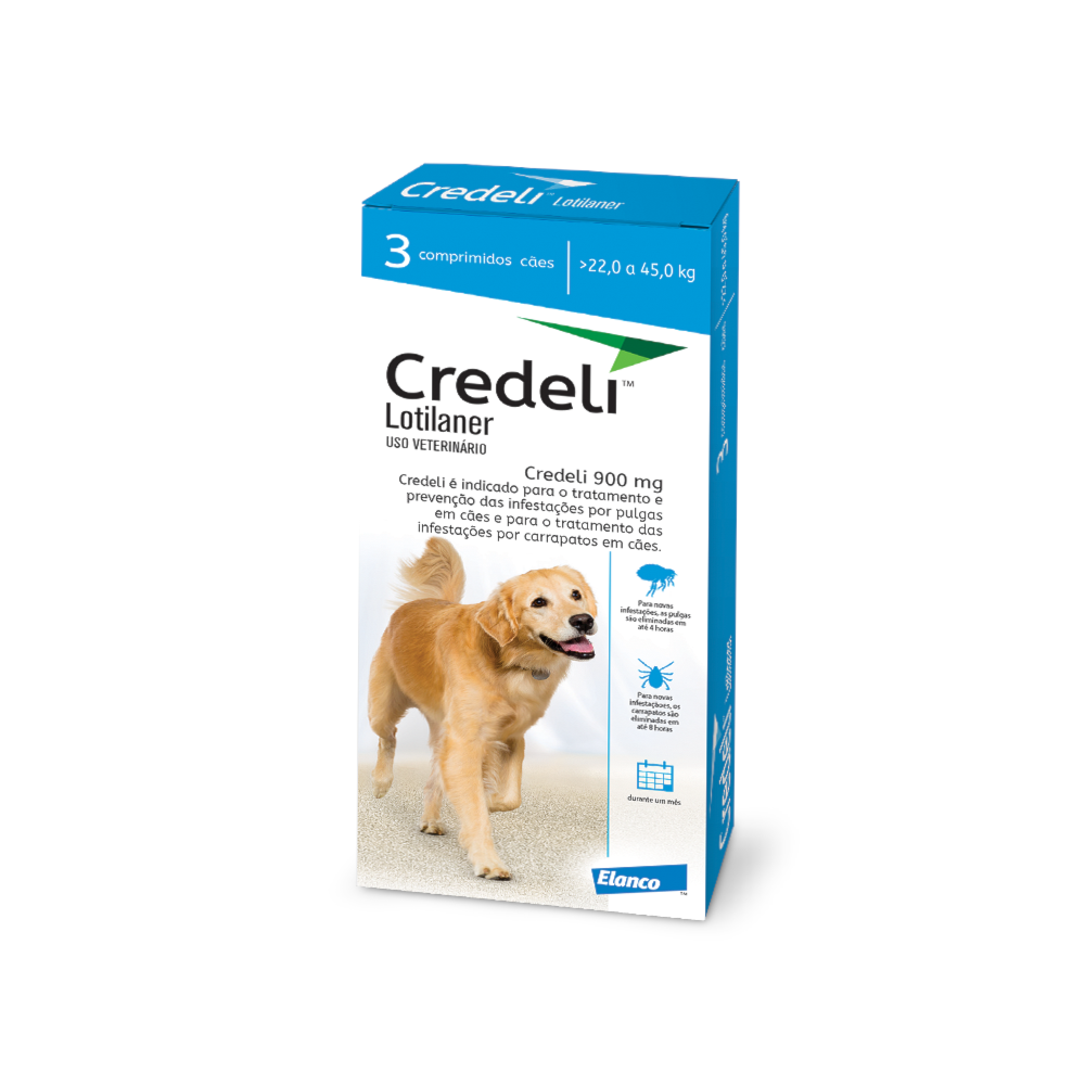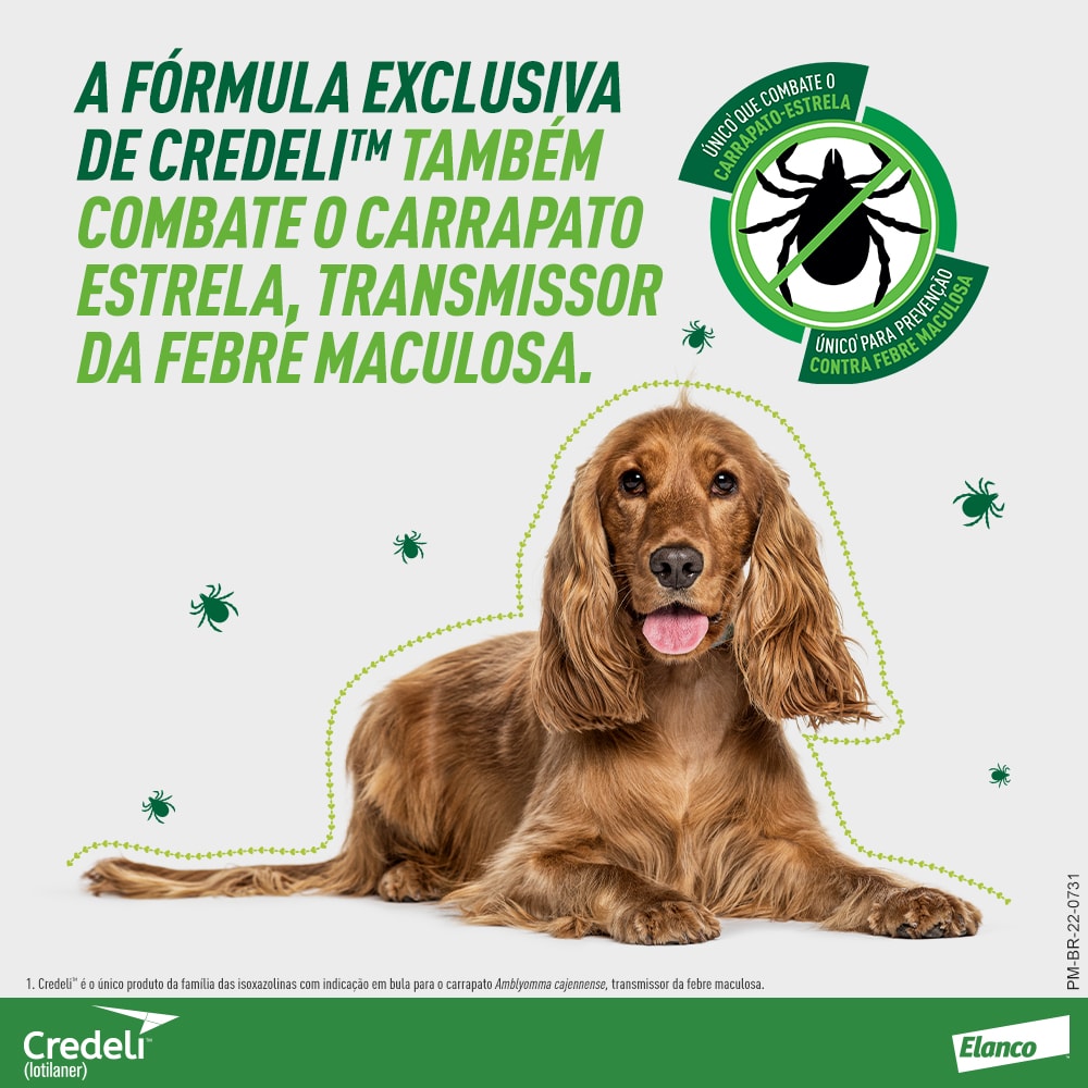 Credeli™ é o comprimido anti carrapatos e antipulgas mais rápido do mercado para cães, com uma molécula própria desenvolvida para essa espécie. Começa a eliminar carrapatos em 4 horas com eliminação de 100% em 8 horas, e pulgas a ação inicia em até 2 horas com eliminação completa em 6 horas! Além de ser o mais rápido do mercado, sua fórmula exclusiva também combate o Amblyomma Cajennense, mais conhecido como carrapato-estrela, causador da febre maculosa. Credeli™ é o único do mercado que possui essa indicação em bula.