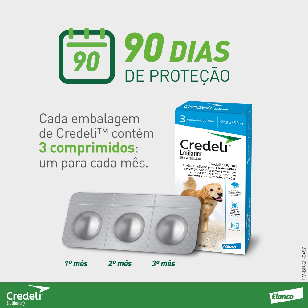 Credeli™ pode ser administrado em filhotes a partir de 1,3kg e 8 semanas de idade. Cada embalagem de Credeli™ contém 3 comprimidos, garantindo 90 dias de proteção para o seu pet!