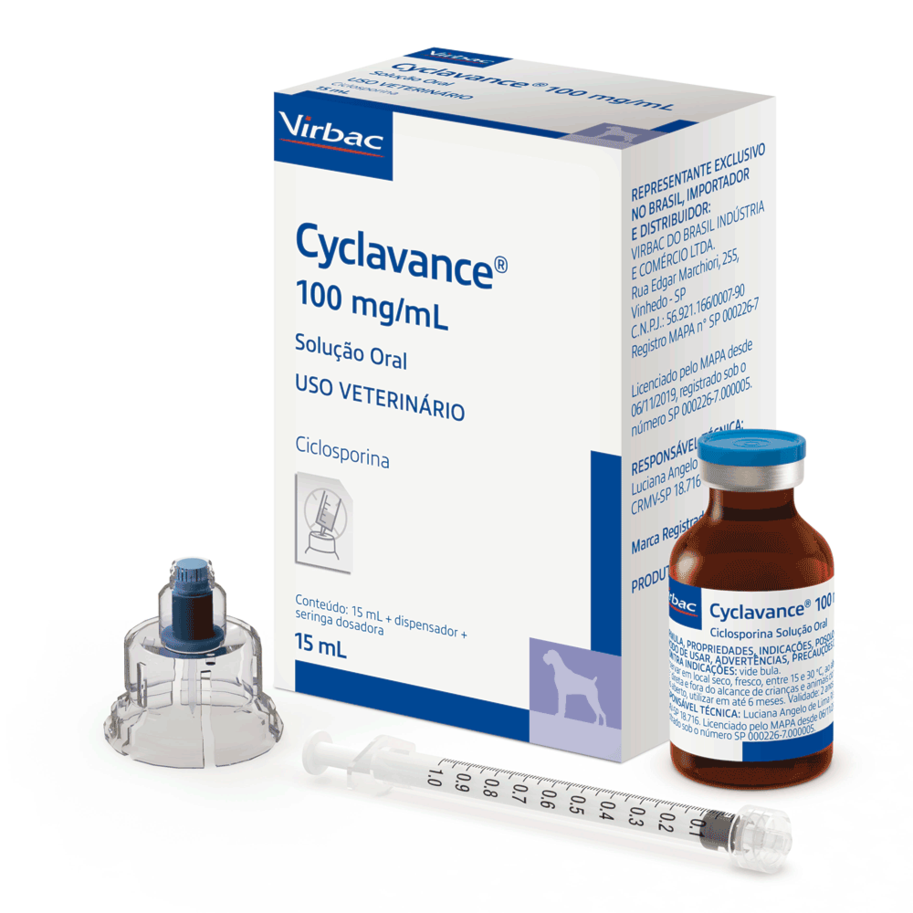 CYCLAVANCE® é uma solução oral à base de ciclosporina 100 mg/mL, indicada para o tratamento e controle da dermatite atópica em cães, aliviando sintomas como prurido intenso, eritema e inflamações cutâneas. Sua ação imunomoduladora atua de forma seletiva e reversível sobre os linfócitos T, bloqueando a liberação de citocinas inflamatórias e proporcionando alívio duradouro e seguro para o pet.