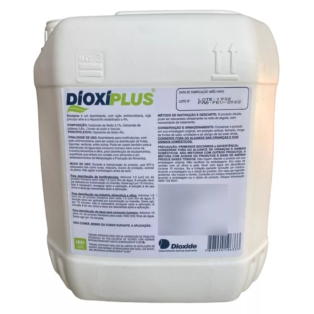 O Dioxiplus é um desinfetante de alta performance, desenvolvido para o controle de fungos e bactérias em frutas, legumes e verduras. Com sua fórmula eficaz, ele prolonga a vida útil dos alimentos, reduzindo perdas e garantindo a qualidade dos produtos.