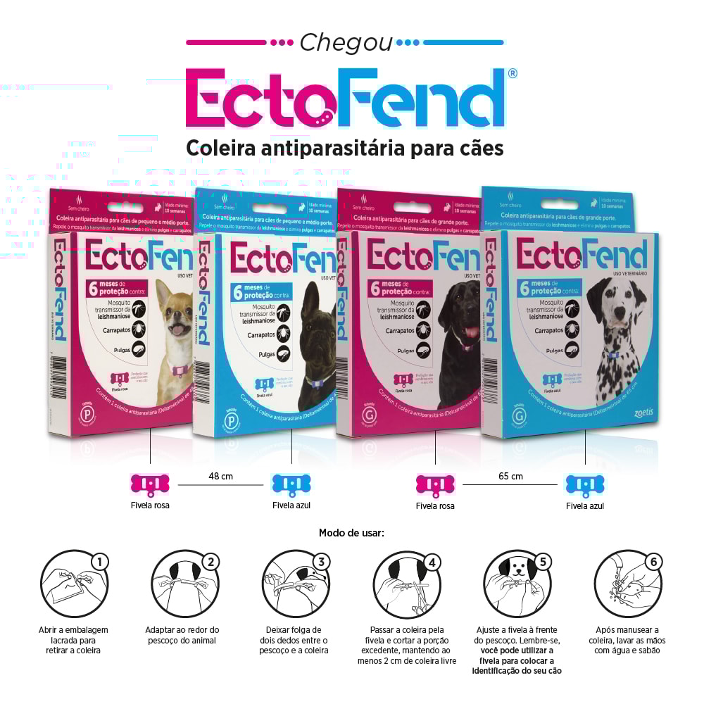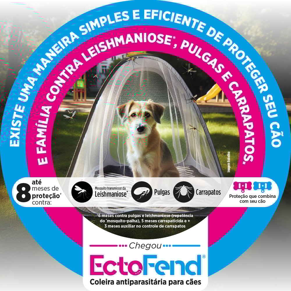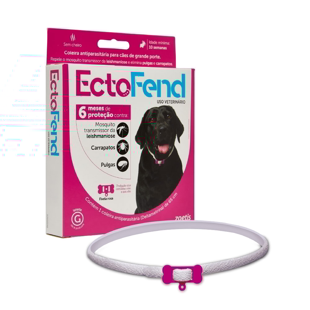 EctoFend® é uma coleira com deltametrina a 4% com ação repelente contra o mosquito-palha (Lutzomyia longipalpis), transmissor da leishmaniose visceral canina. Também possui ação ectoparasiticida, com indicação no controle de infestações causadas por pulgas e carrapatos.