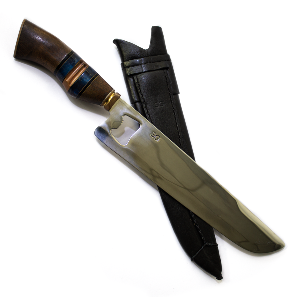 Faca Artesanal SG com Abridor de Garrafas de Inox de 10 Polegadas, Lâmina de 3mm, Cabo Colorido e Bainha - COD 10.10C