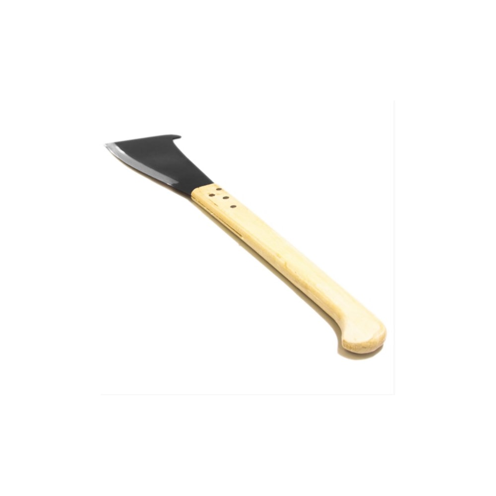 Ferramenta produzida em chapa de 1,3 mm de espessura de puro aço carbono 1070 com adicional de cromo e dureza 48° / 52° HCR, o que faz com que o corte seja firme e perfeito. O cabo é em madeira Marfim fixado com rebites de ferro maciço.